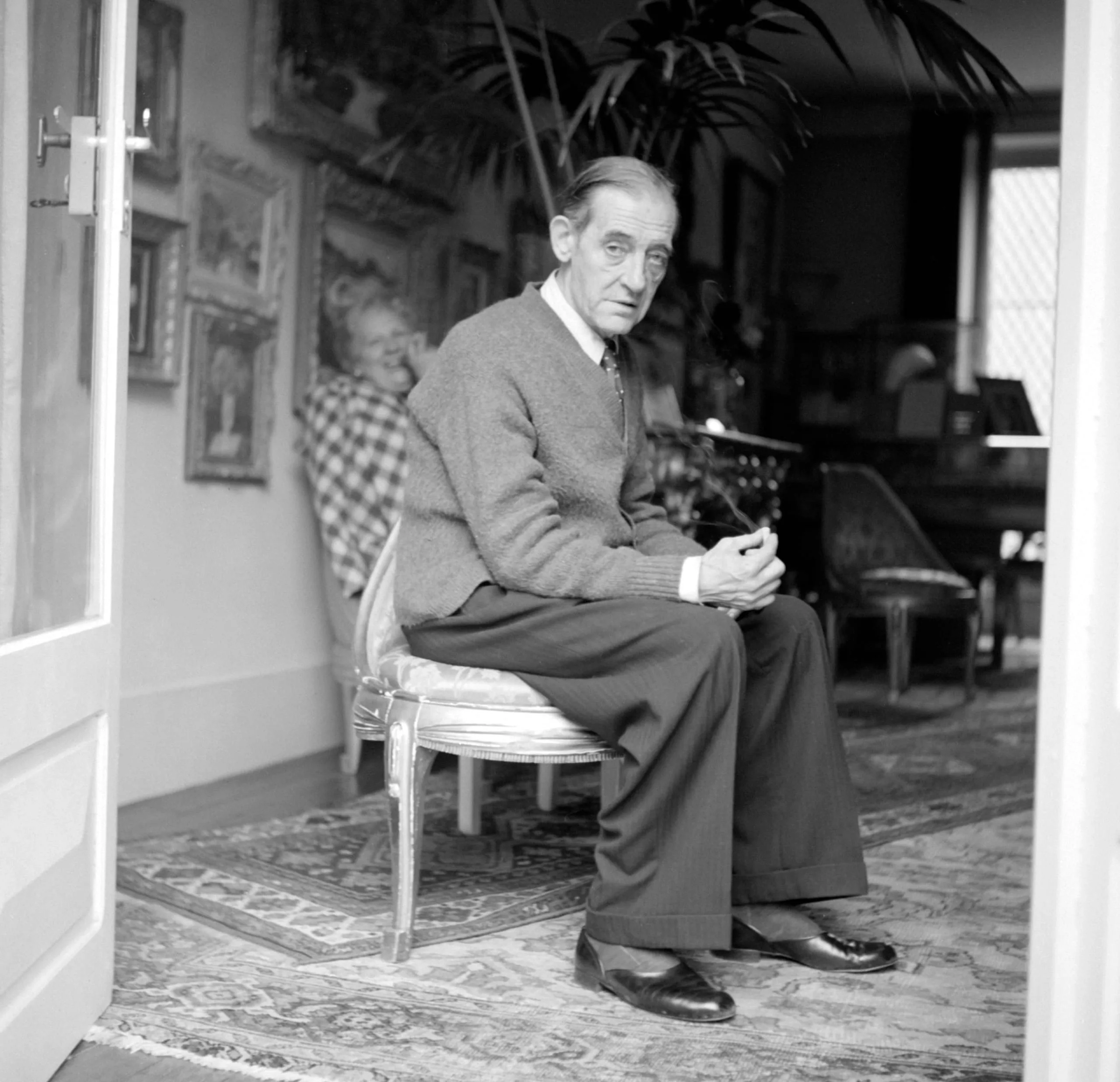 Black and white photograph of an older white man in a sweater and dark trousers seated in an ornate chair in a doorway, hands clasped, looking at the camera