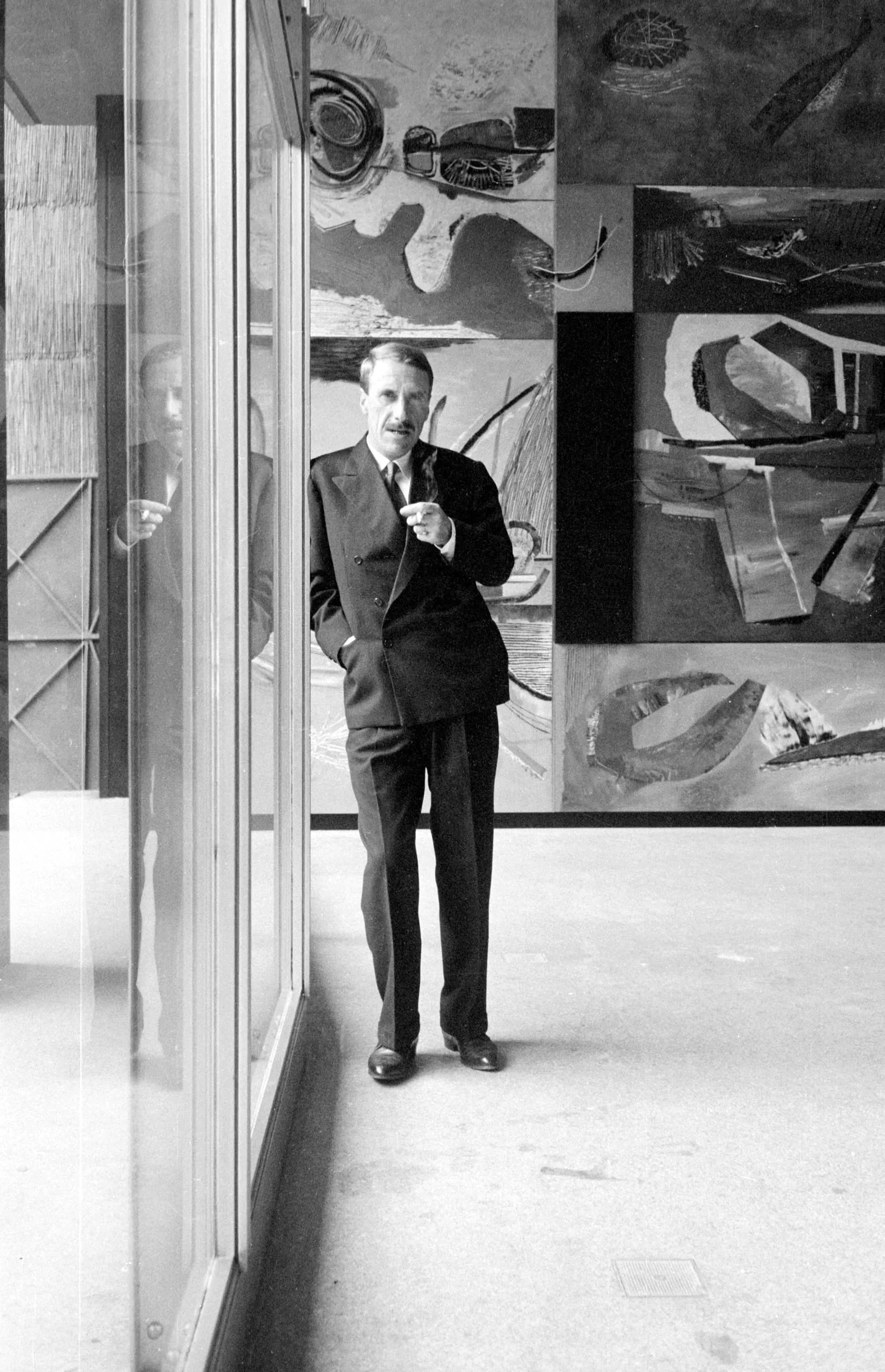 Black and white photograph of a man in a double-breasted suit standing in a gallery, large abstract paintings visible on the wall behind him, his reflection caught in glass at left