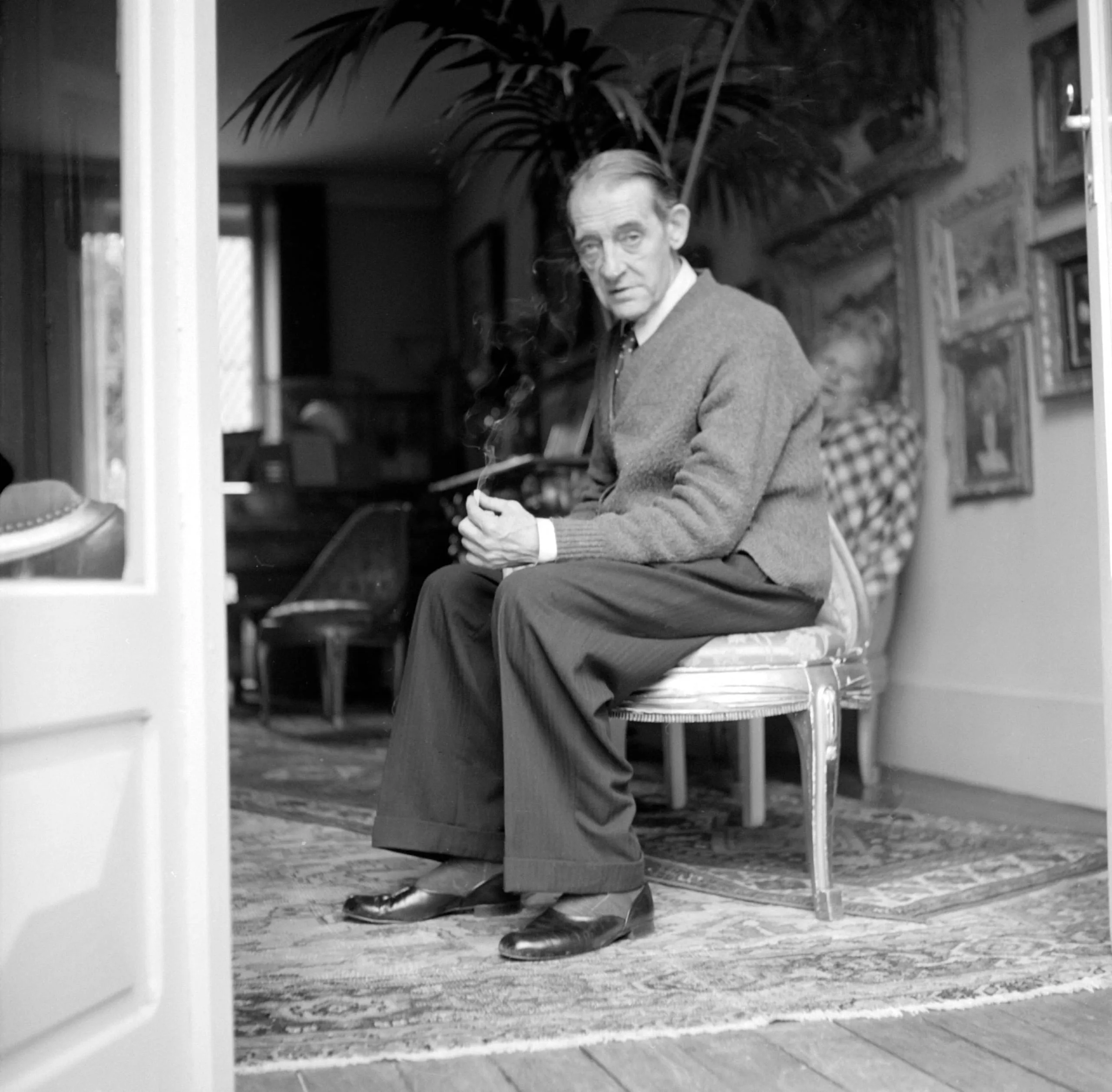 Black and white full-length photograph of an elderly man seated on an ornate chair, holding a smoking pipe, photographed through an open doorway
