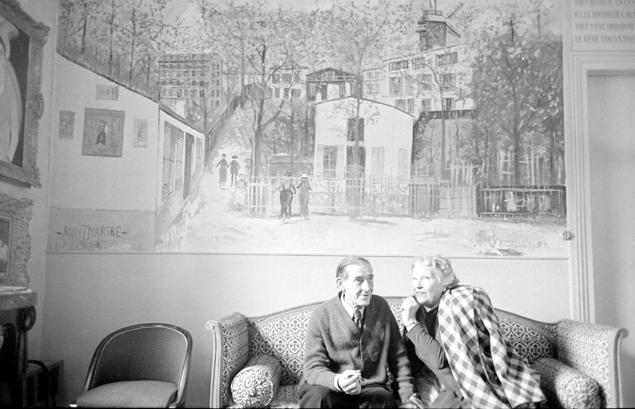 Black and white photograph of a man and woman seated together on a patterned sofa beneath a large painted mural of a Parisian street scene labeled "MONTMARTRE"