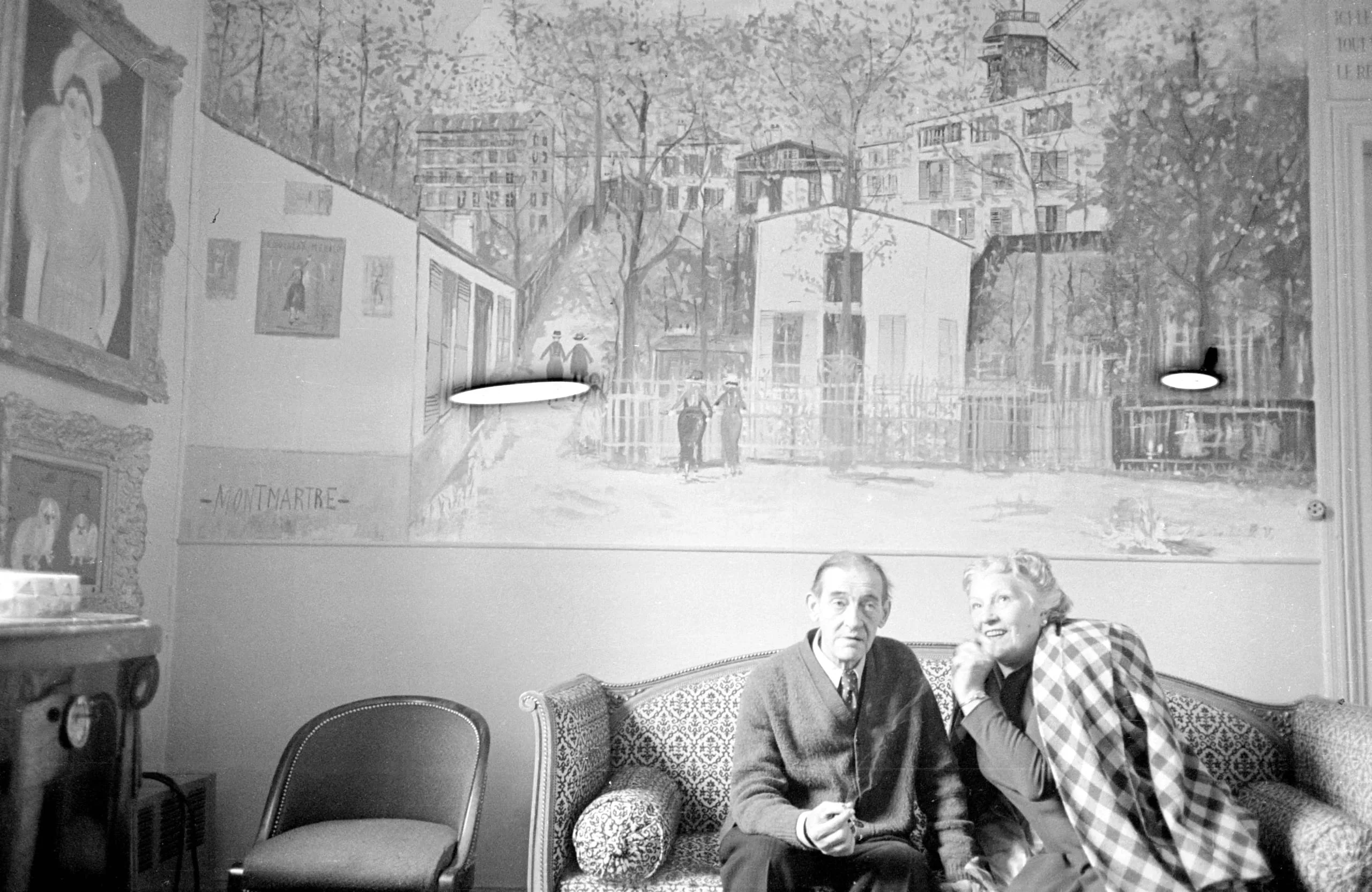 Black and white photograph of a man and woman seated together on a patterned sofa beneath a large painted mural of a Parisian street scene labeled 'MONTMARTRE'
