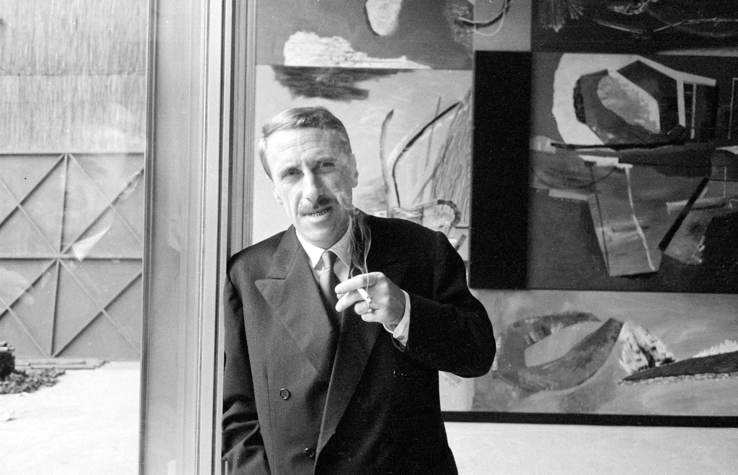 Black and white photograph of a man in a dark suit holding a cigarette, standing in front of a large abstract painting with gestural forms