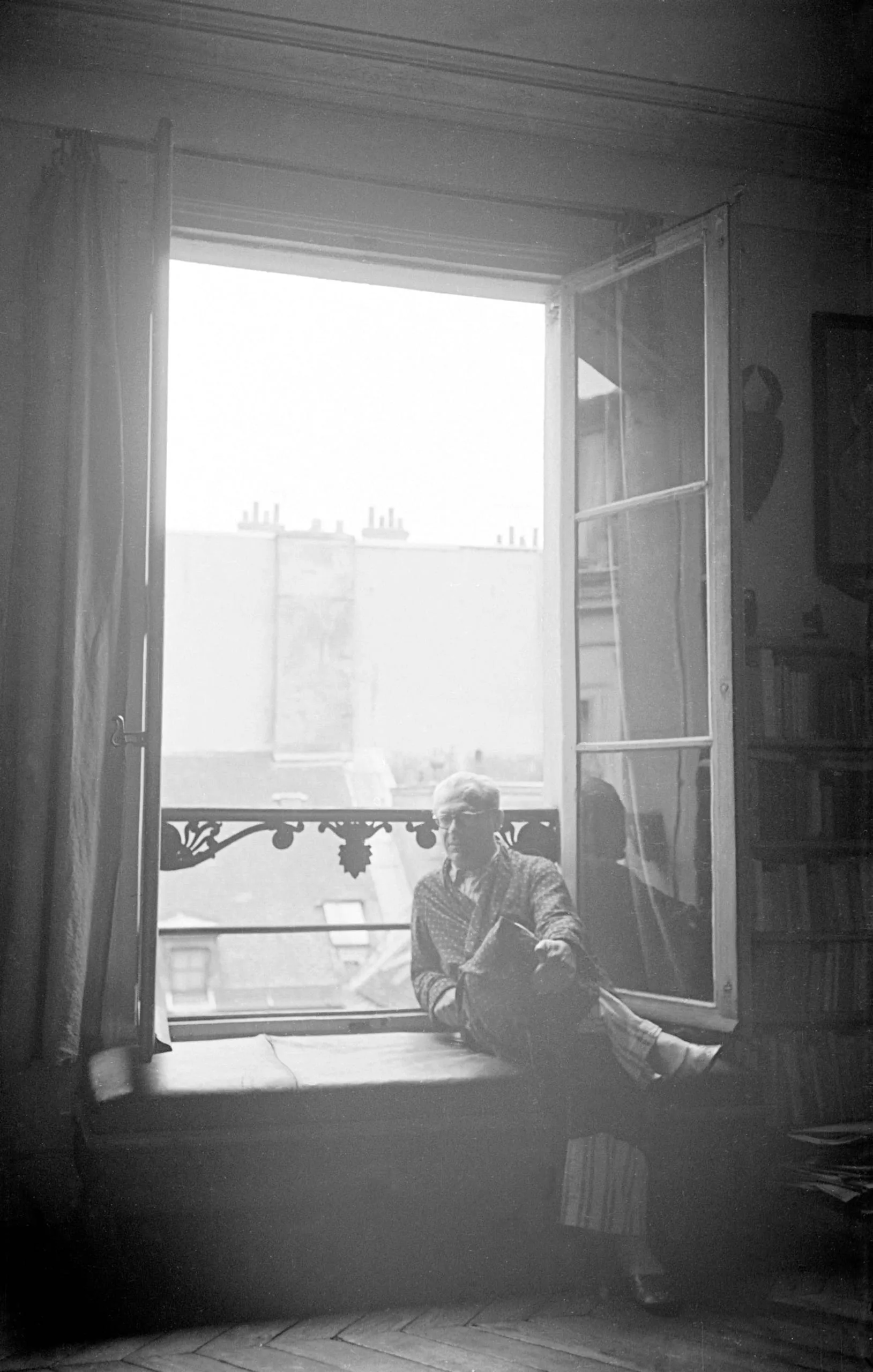Black and white photograph of a person seated in silhouette on a windowsill of open French doors, backlit by bright daylight, with Parisian rooftops visible beyond a wrought-iron balcony railing