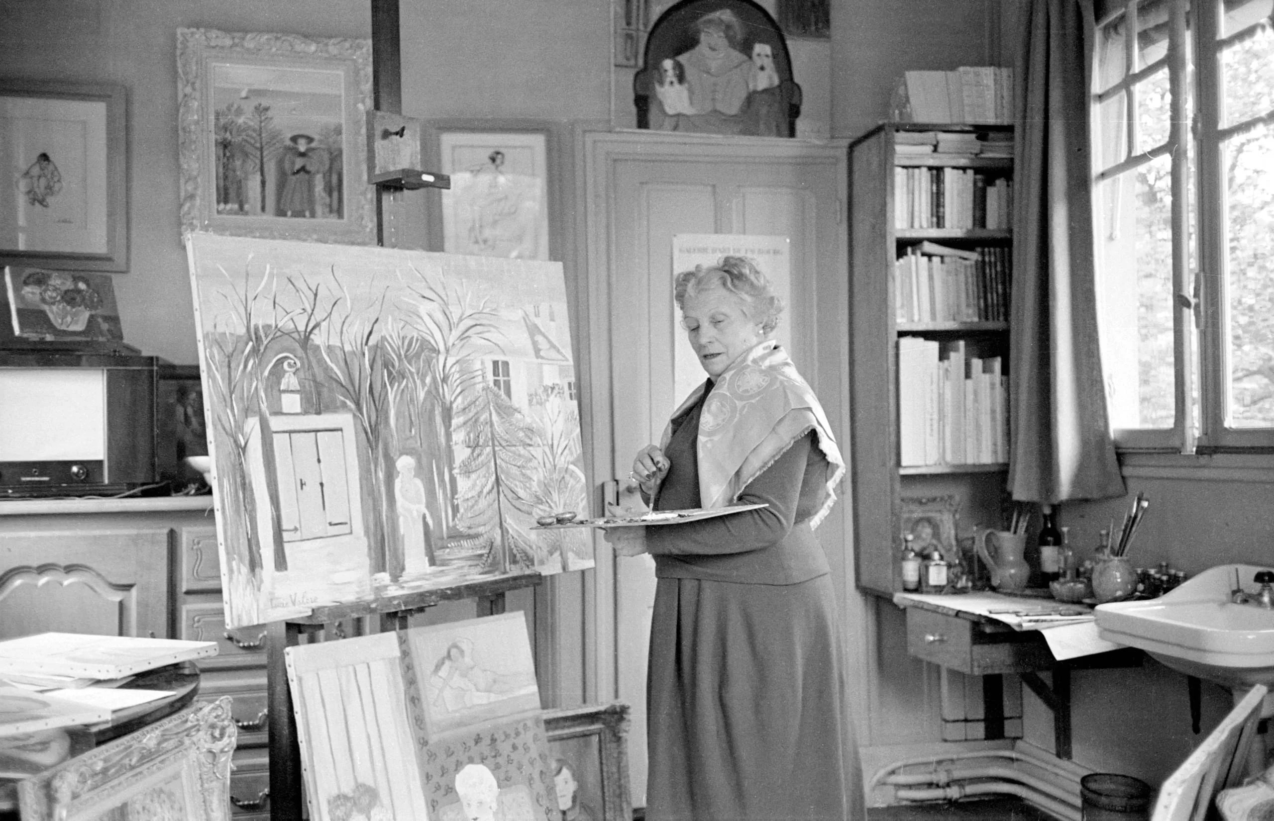 Black and white photograph of a woman standing at an easel in an art studio, holding a palette and brush, surrounded by paintings and art supplies