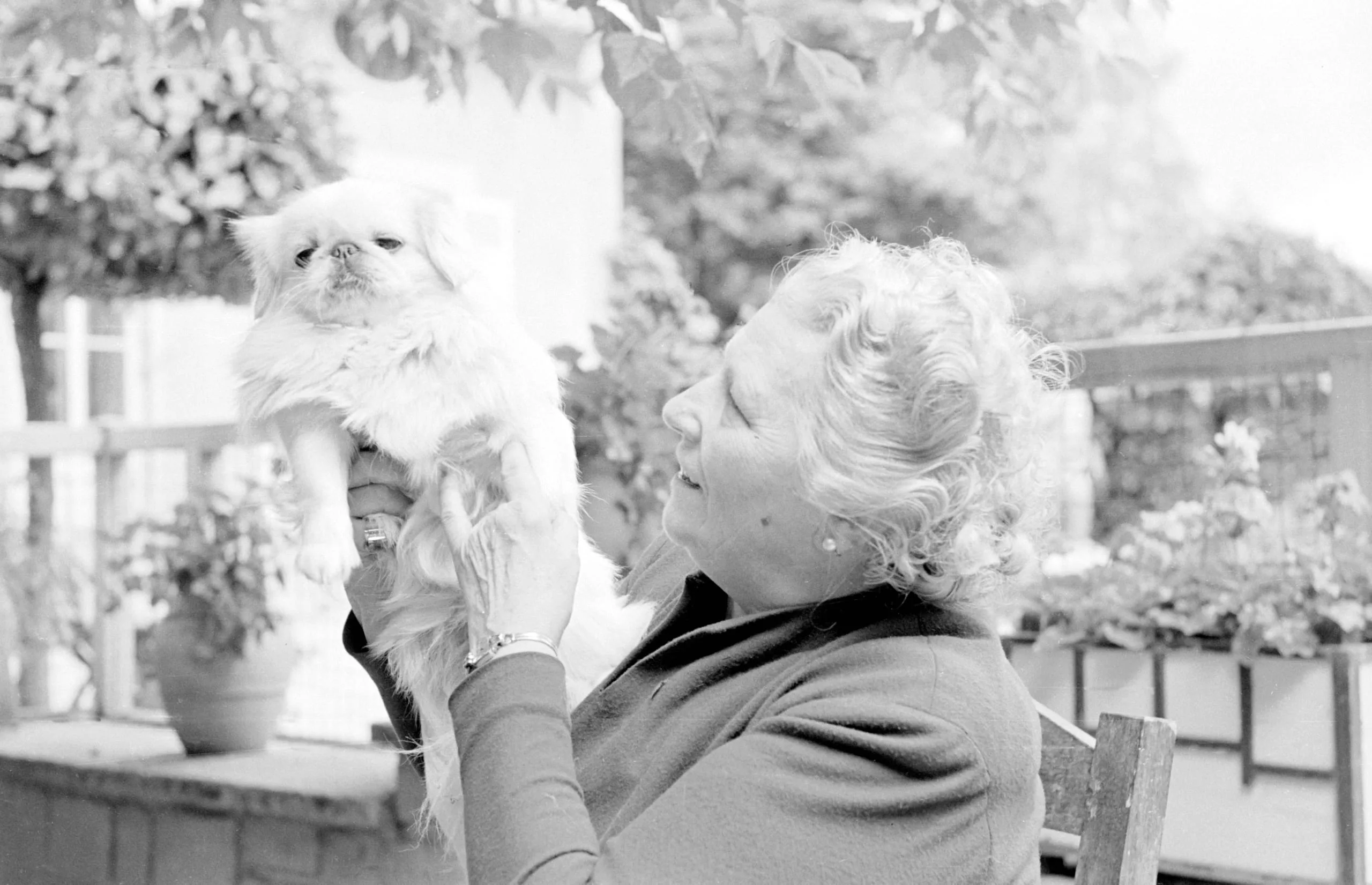 Black and white photograph of a curly-haired white woman holding a small fluffy white dog up to her face in an outdoor garden setting