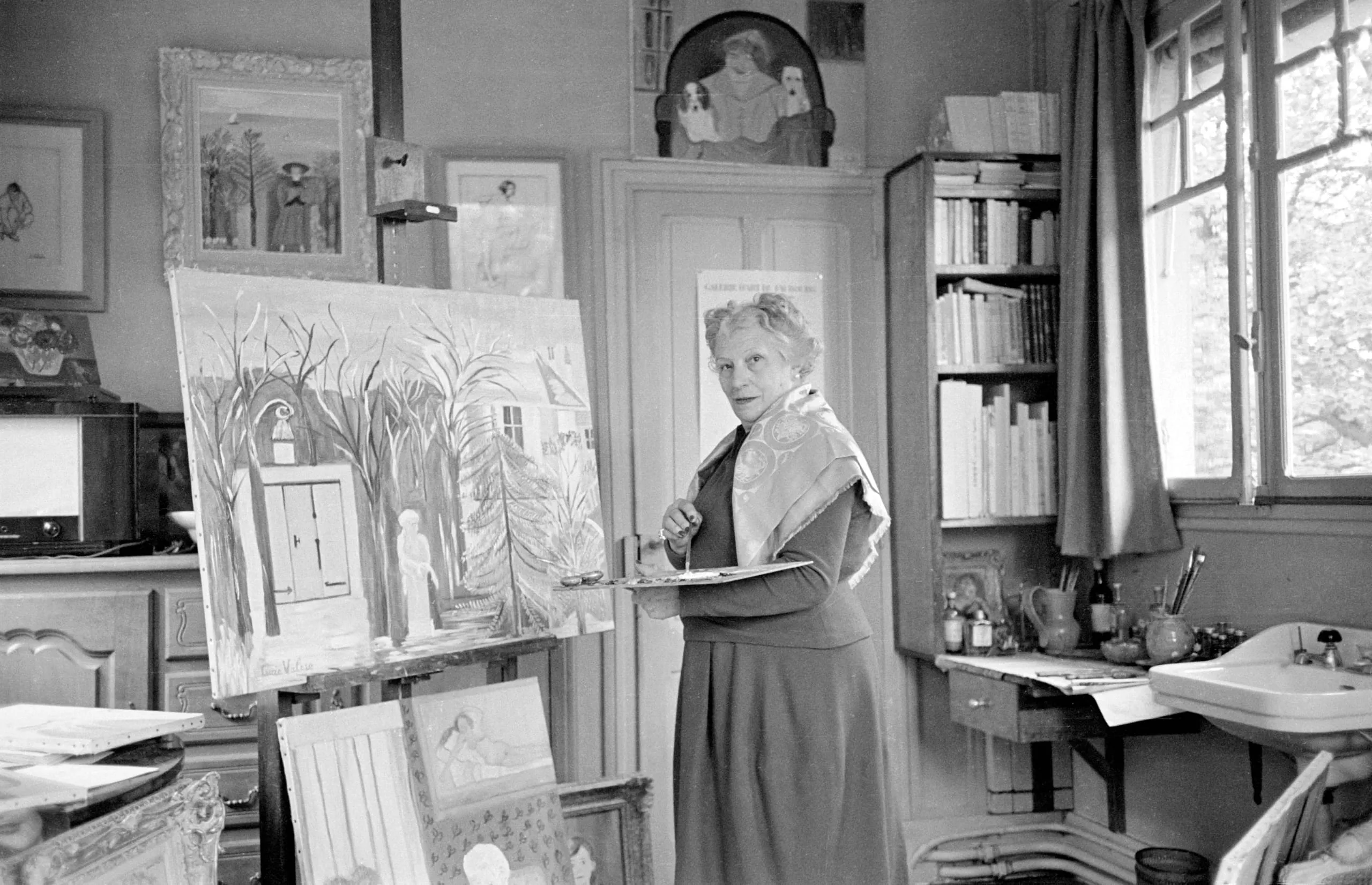 Black and white photograph of a woman holding a palette and brush, standing before a canvas on an easel in a studio filled with paintings, books, and art supplies