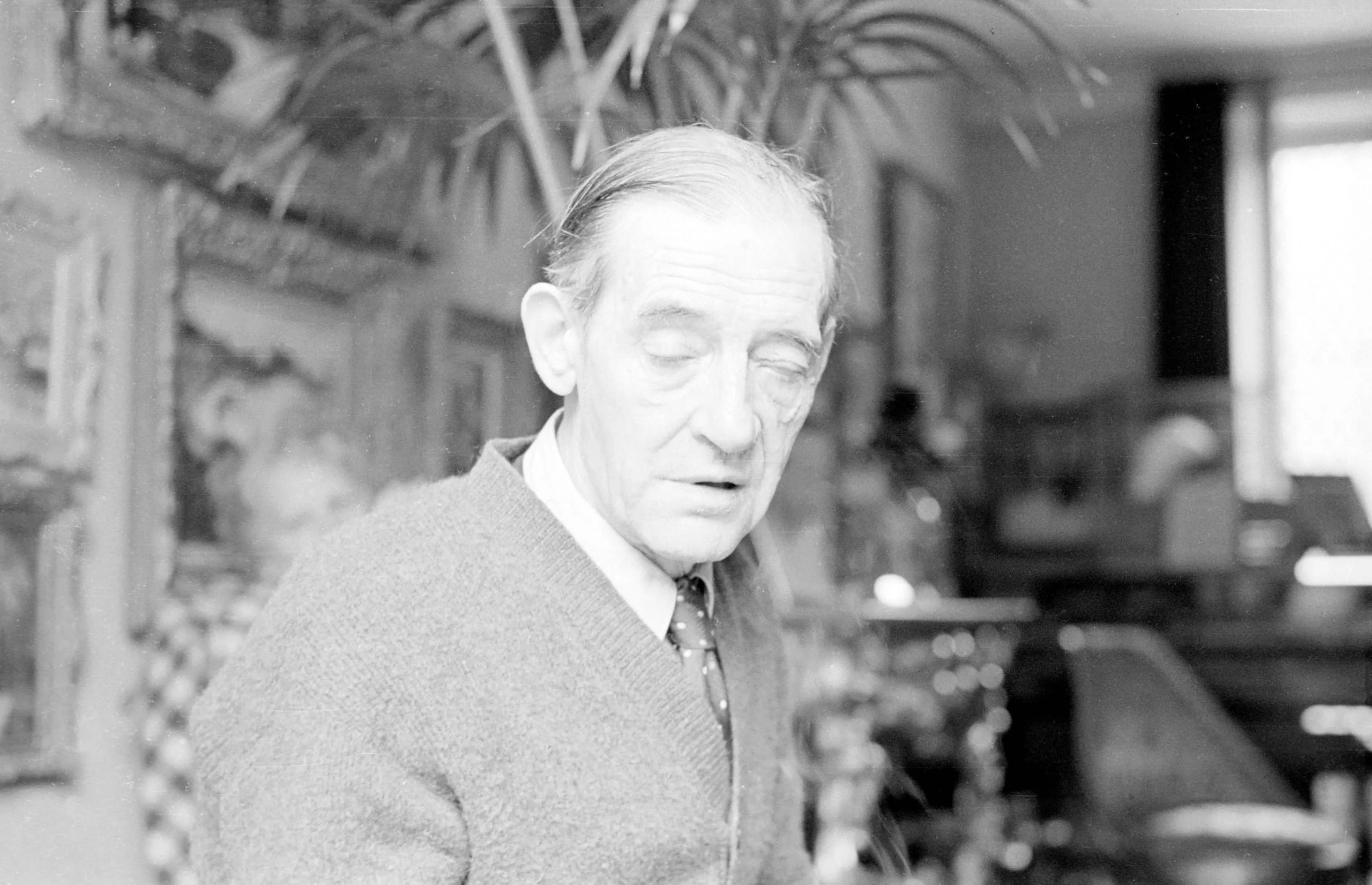 Black and white photograph, chest-up portrait of an older white man with deeply lined features, wearing a V-neck sweater and tie, head tilted downward