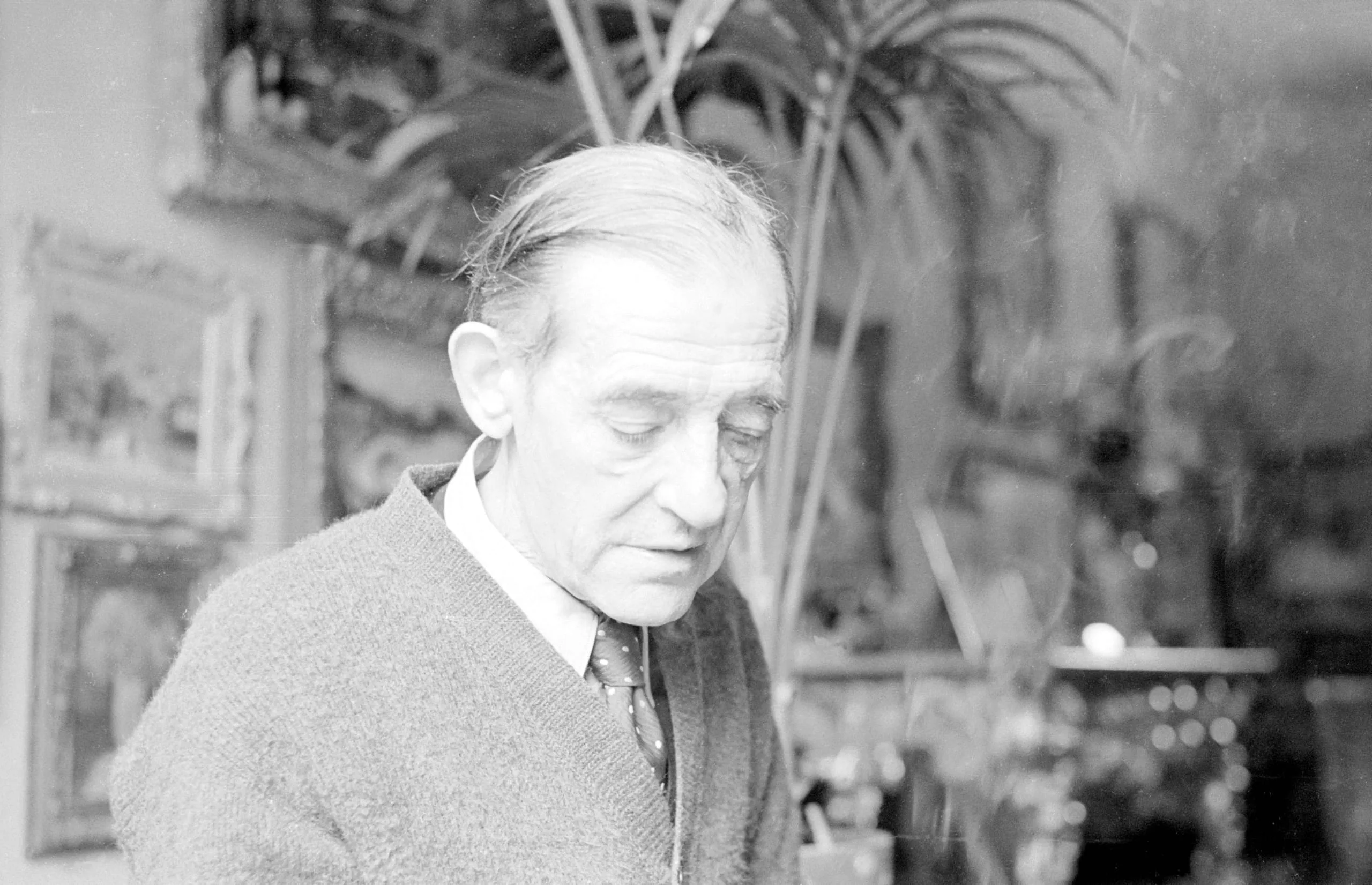 Black and white photograph, chest-up portrait of an older white man in a knit sweater and polka-dot tie, head tilted downward, with a softly blurred studio interior behind him