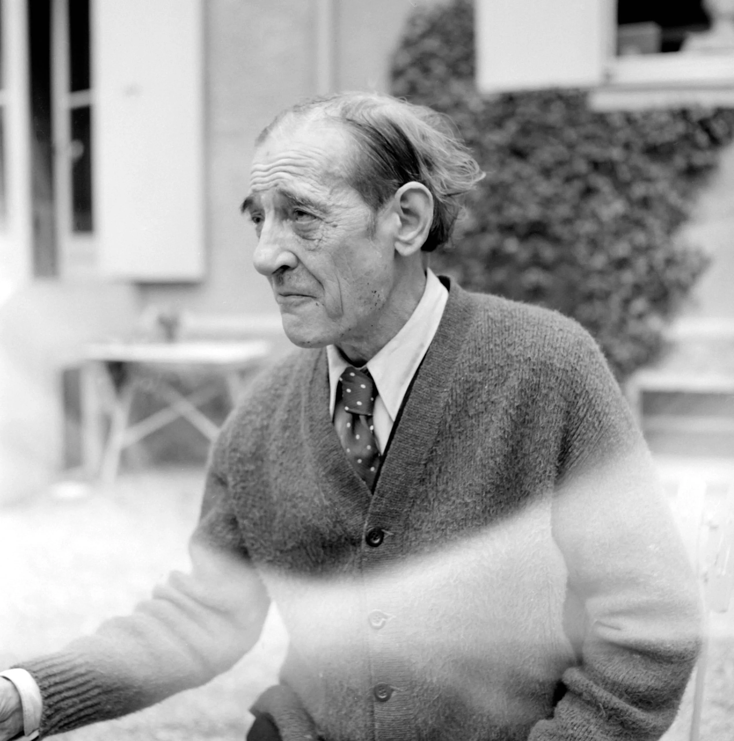 Black and white photograph, older man in three-quarter profile seated outdoors, wearing a cardigan, dress shirt, and polka-dot tie, soft diffused light