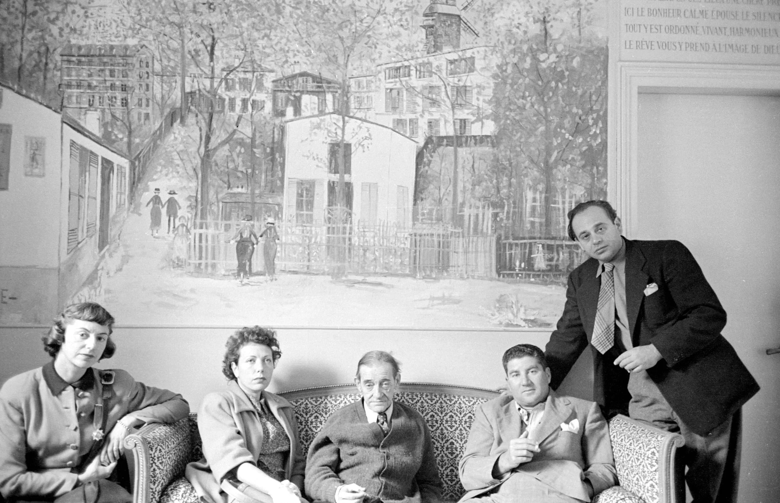 Black and white photograph of four people seated on a patterned sofa and one man standing to the right, posed in front of a painted Parisian street scene mural with partially legible French text above
