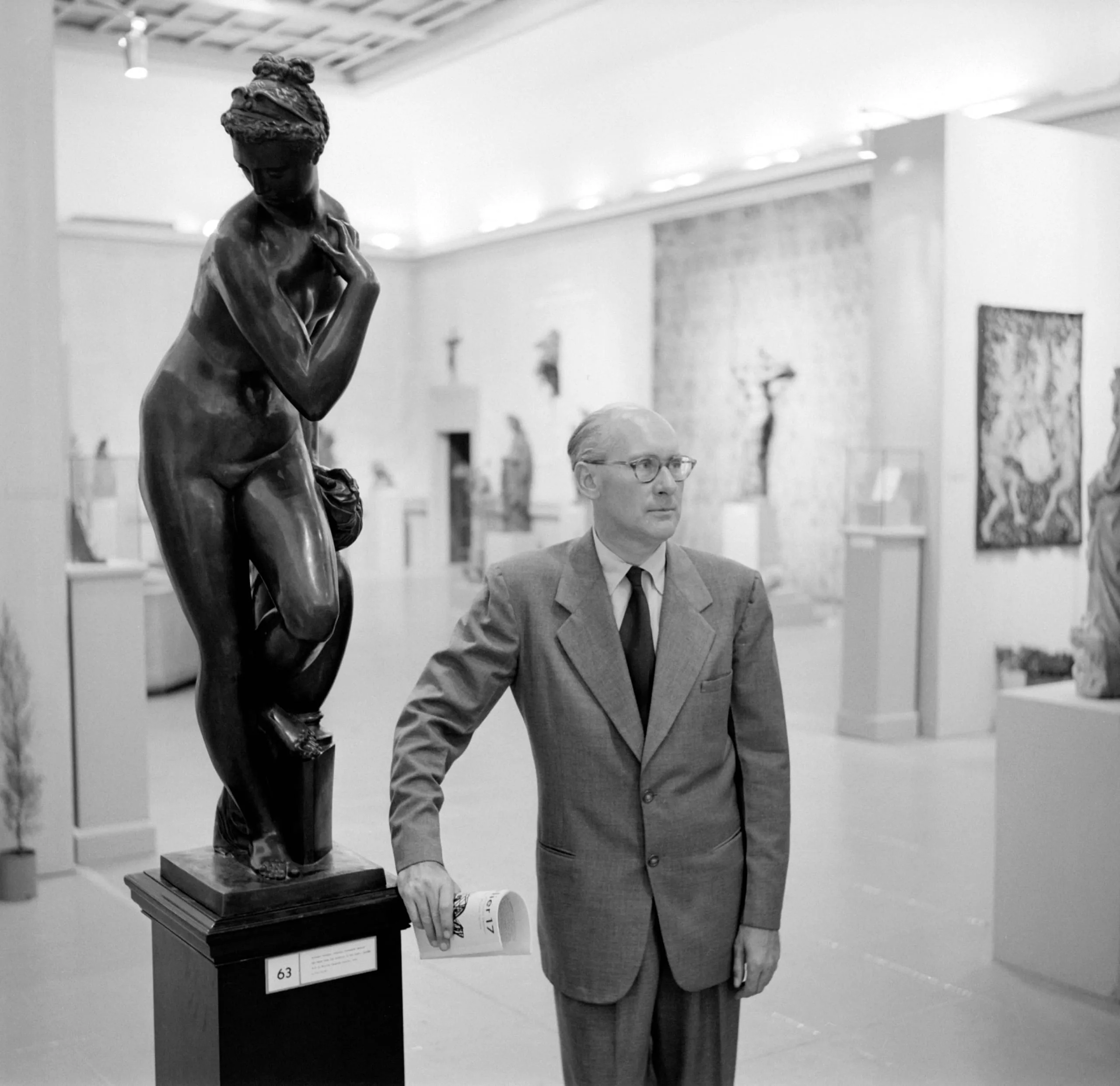 Black and white photograph of a man in a suit standing beside a dark bronze nude female sculpture on a pedestal in a gallery setting