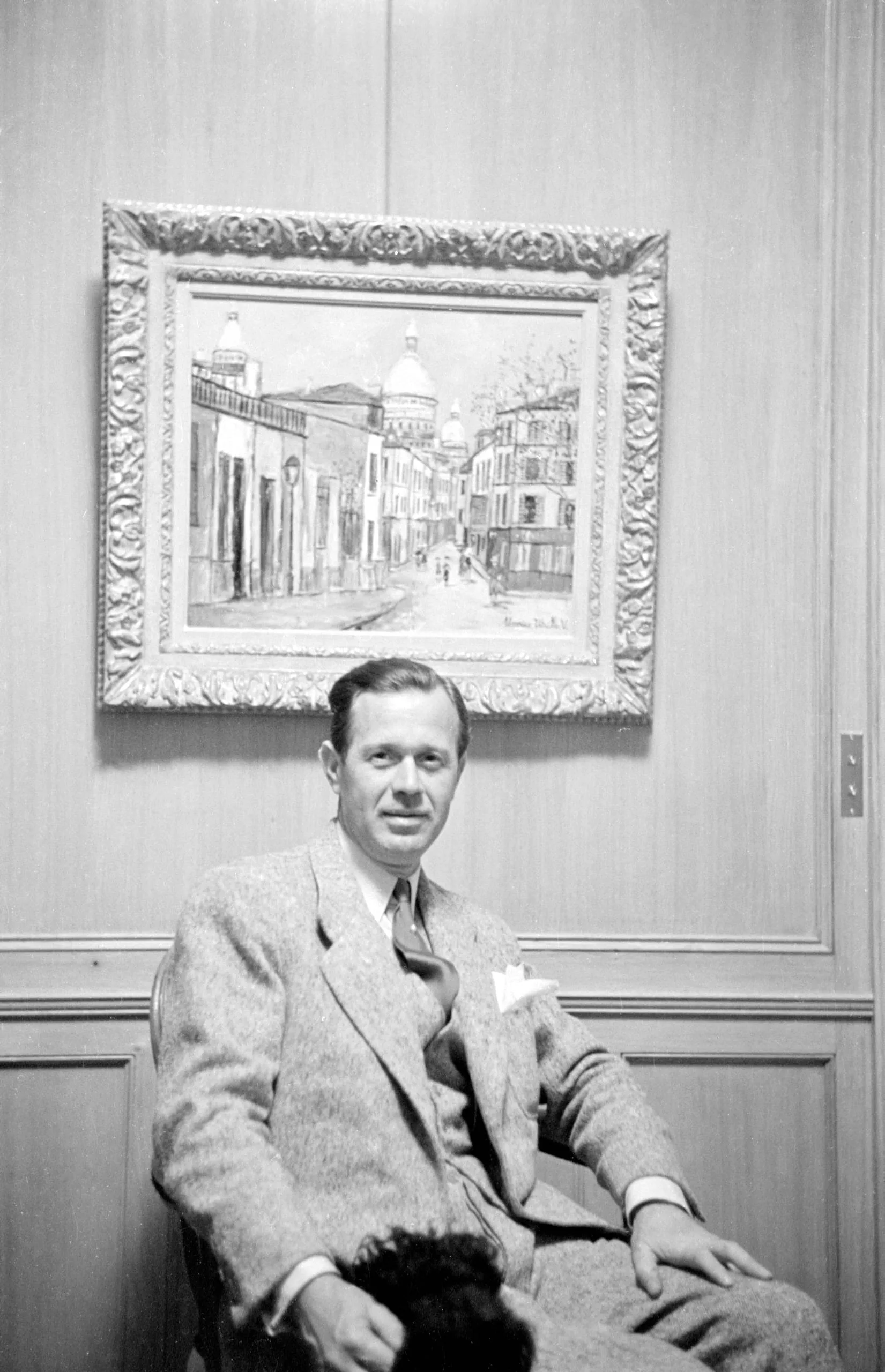 Black and white photograph of a white man in a tweed suit seated before a wood-paneled wall, with a framed European street scene painting hanging above him
