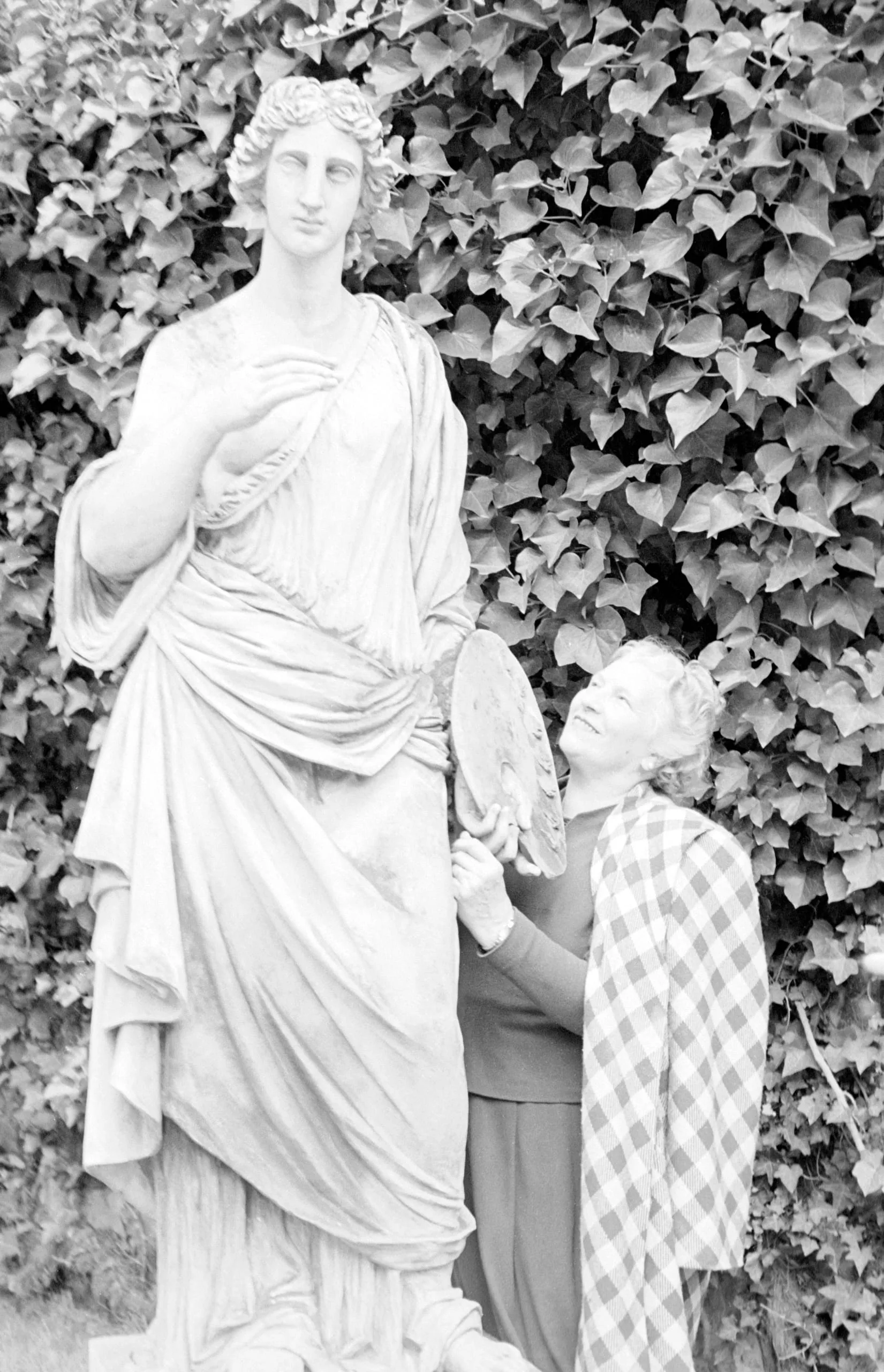 Black and white photograph of a classical stone sculpture of a draped female figure outdoors, beside a woman kneeling and holding a painter's palette up toward the statue, ivy-covered wall behind