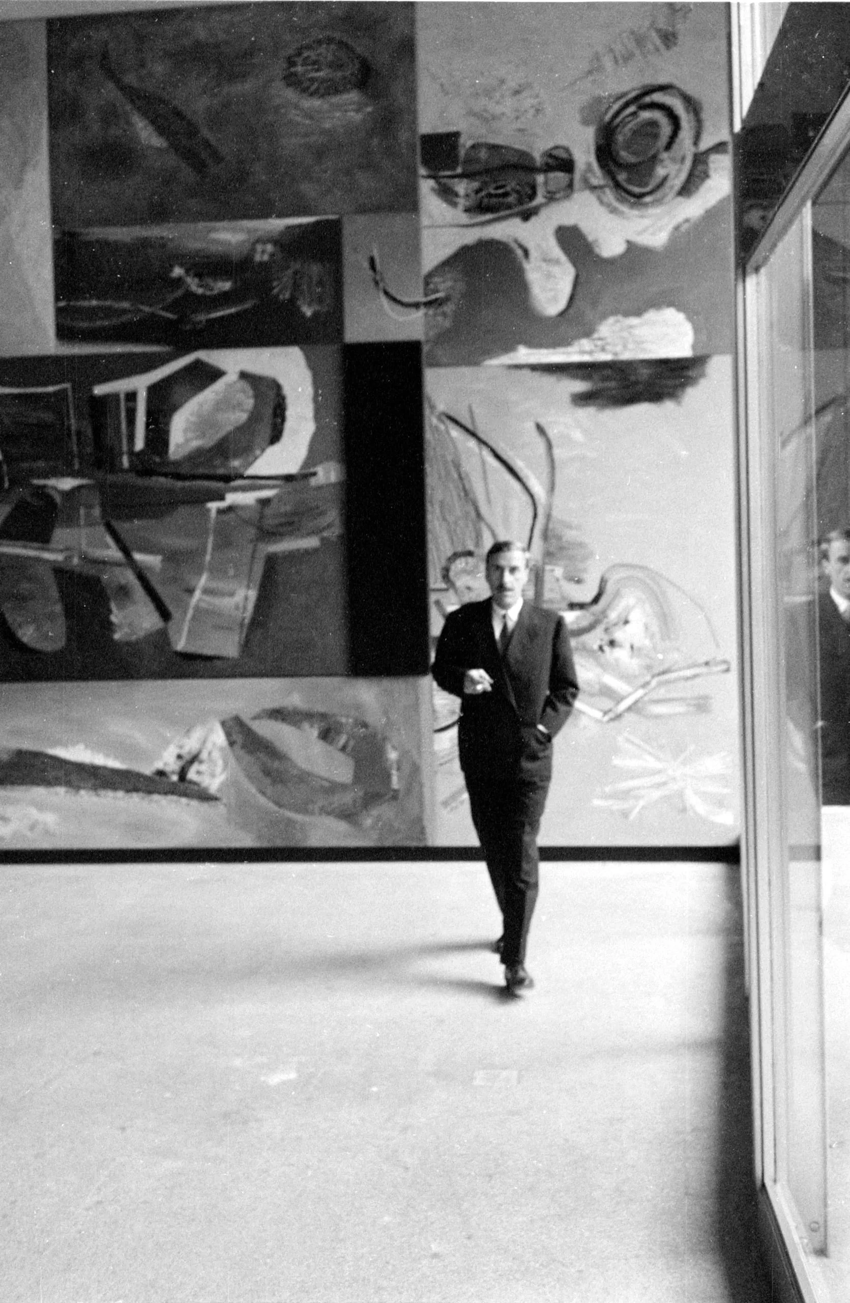 Black and white photograph of a man in a dark suit walking toward the camera in a gallery, two large abstract paintings visible on the wall behind him