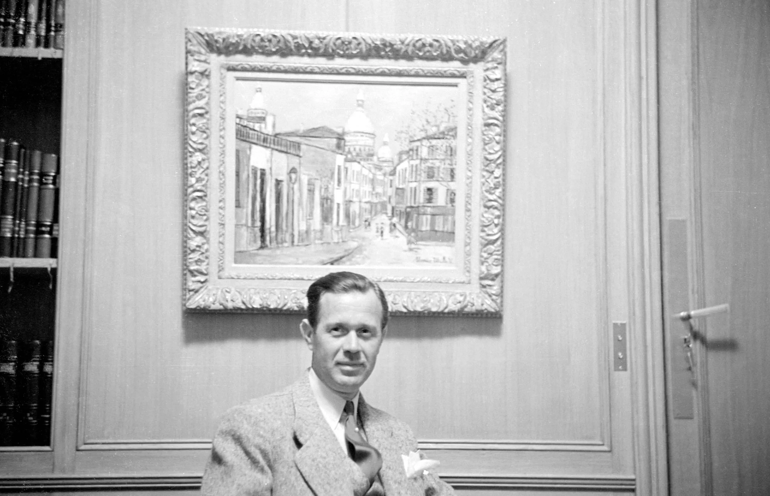 Black and white photograph of a man in a tweed jacket seated in front of a wall-hung framed painting depicting a European street scene with a domed building