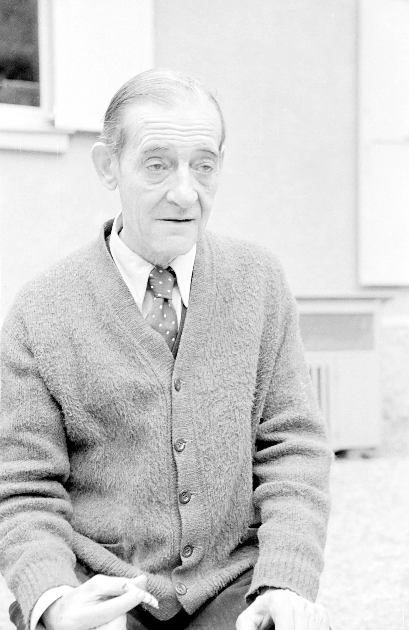 Black and white photograph, older white man seated from the waist up, wearing a cardigan sweater and polka-dot tie, looking toward the camera