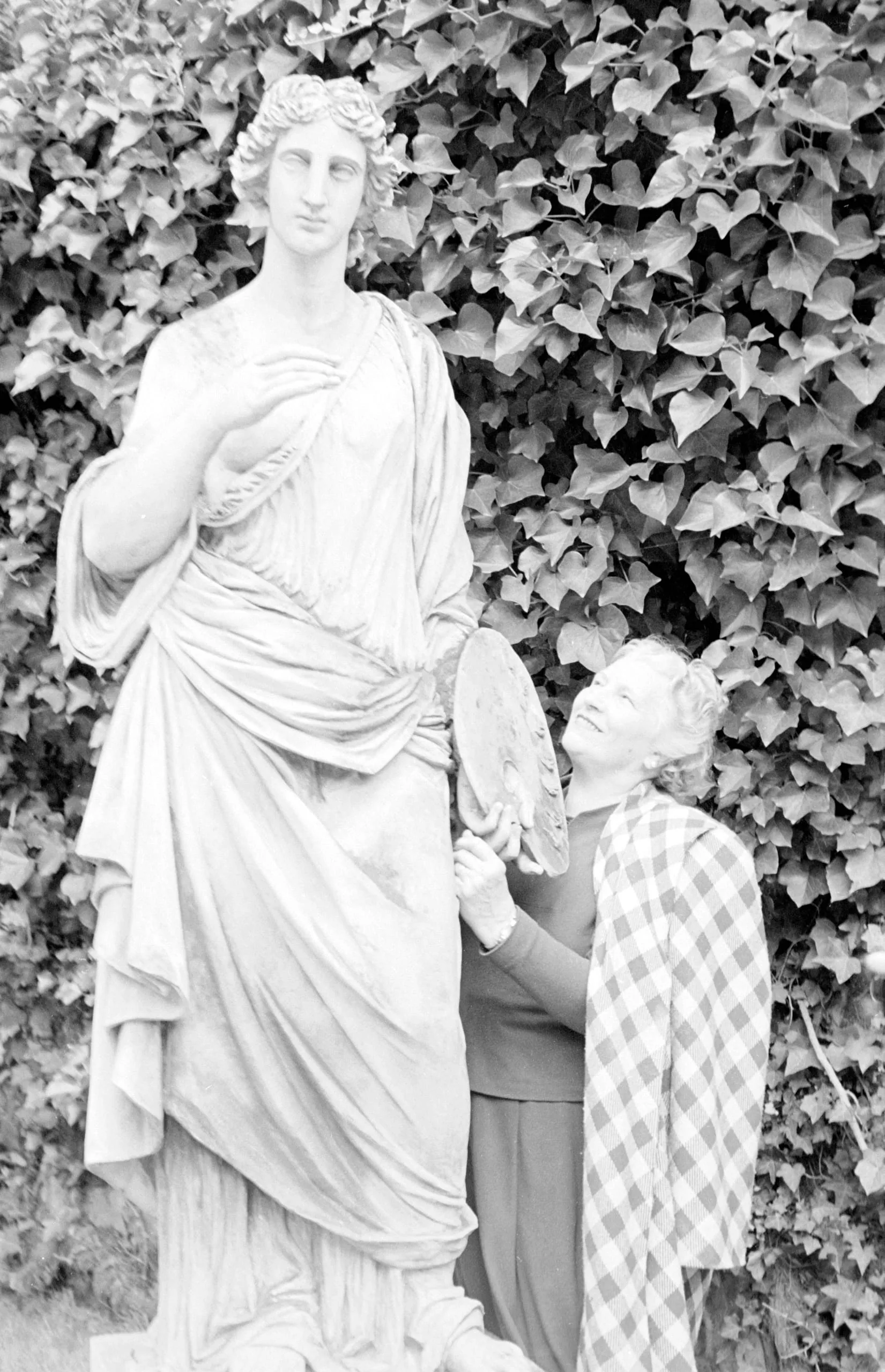 Black and white photograph of a classical-style stone sculpture of a draped woman standing before an ivy wall, with a living woman in plaid kneeling beside it and looking up
