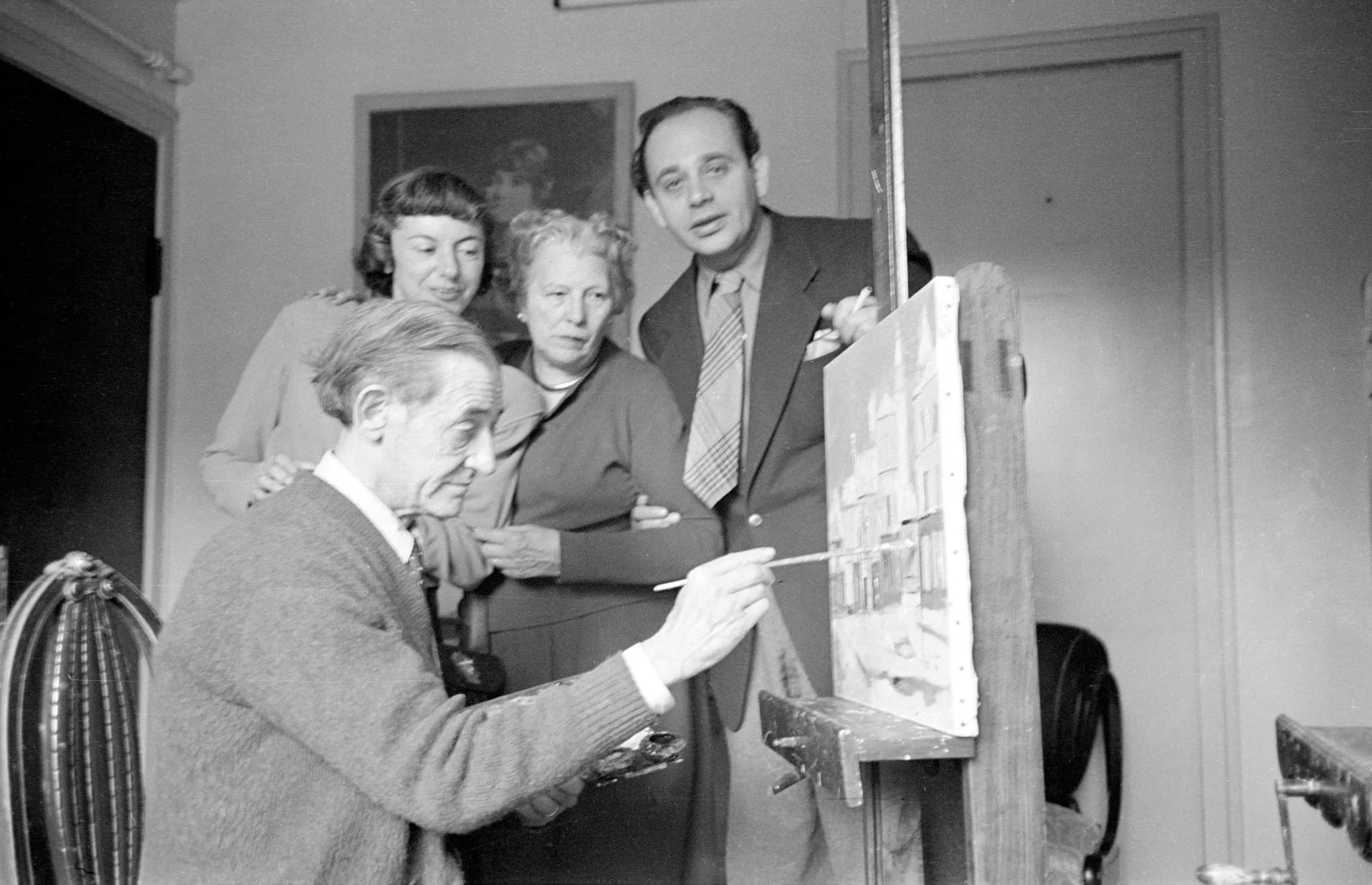 Black and white photograph of a man painting at a wooden easel while three people look on in an interior room
