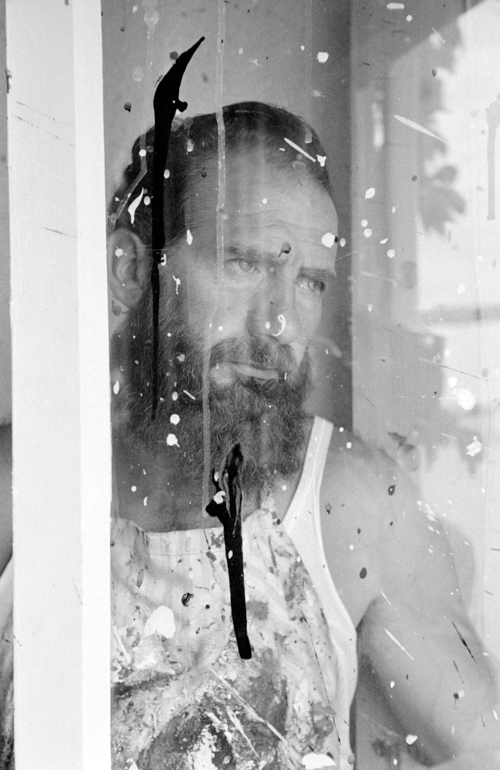 Black and white photograph of a bearded man in a paint-splattered apron viewed through a glass pane covered in paint drips and flecks