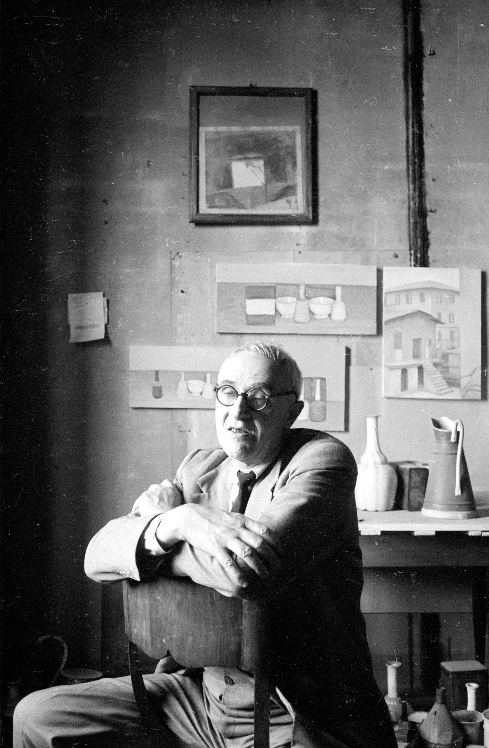 Black and white photograph of an older man in a suit and round glasses, seated straddling a chair in an art studio, paintings and ceramic vessels visible behind him