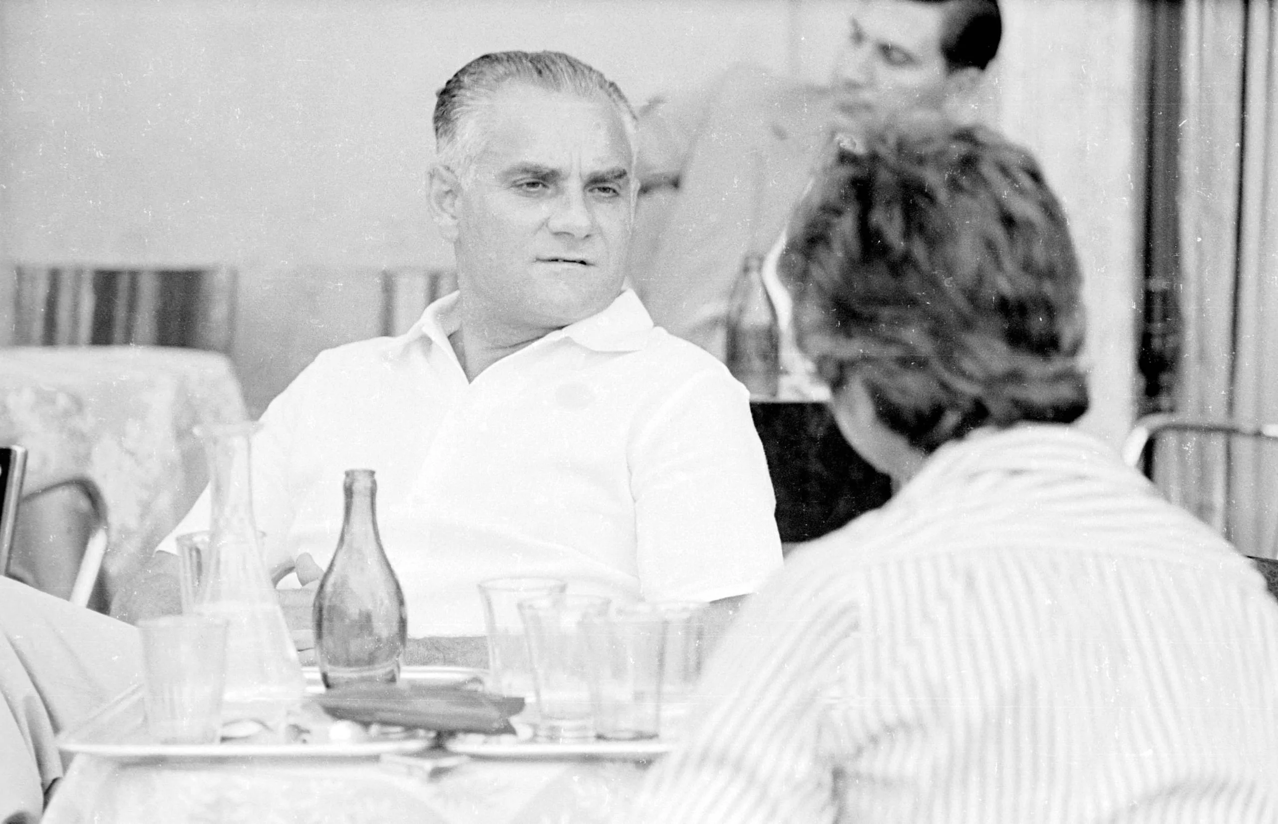 Black and white photograph of two men seated at a table with glasses and a bottle, one facing the camera in a white short-sleeved shirt, the other seen from behind in a striped shirt