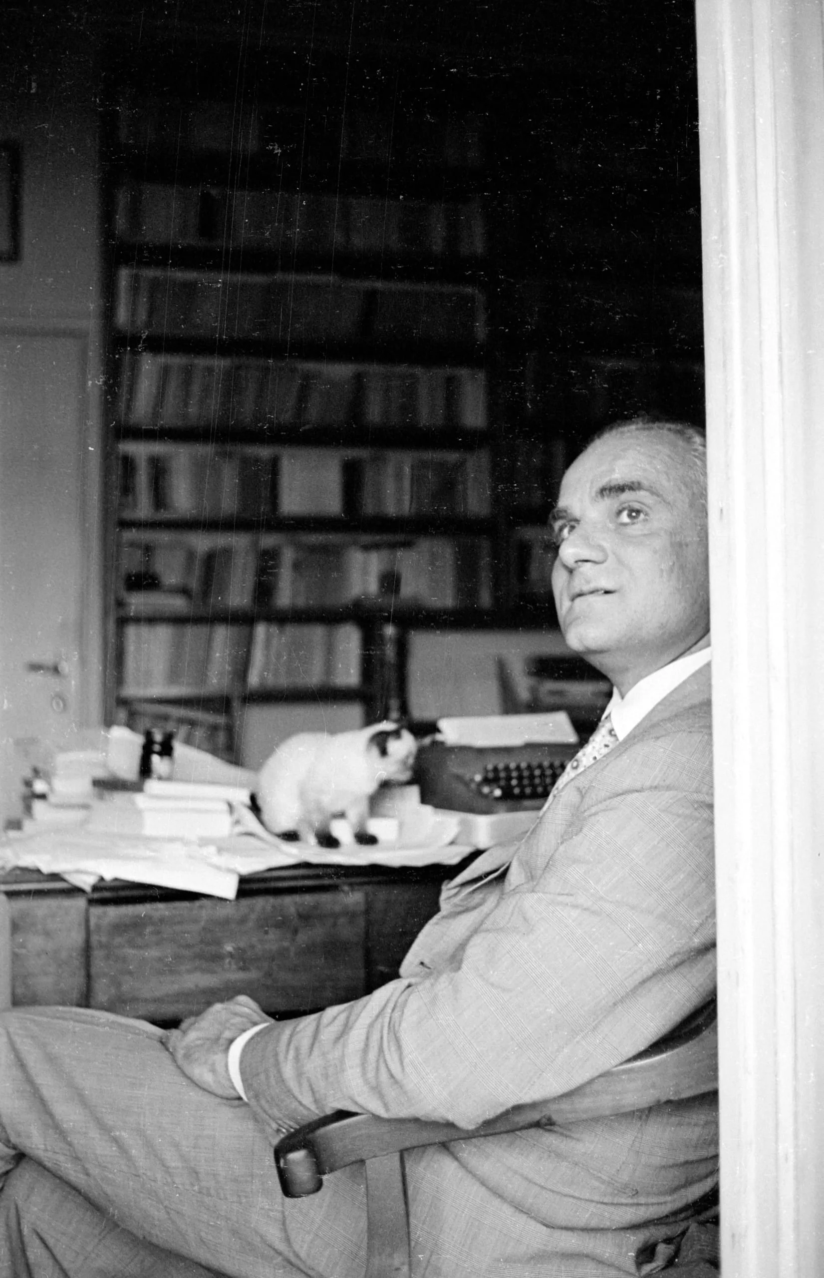 Black and white photograph of a white man in a suit seated beside a doorframe, looking upward, with a cat standing on a paper-covered desk and bookshelves visible in the background
