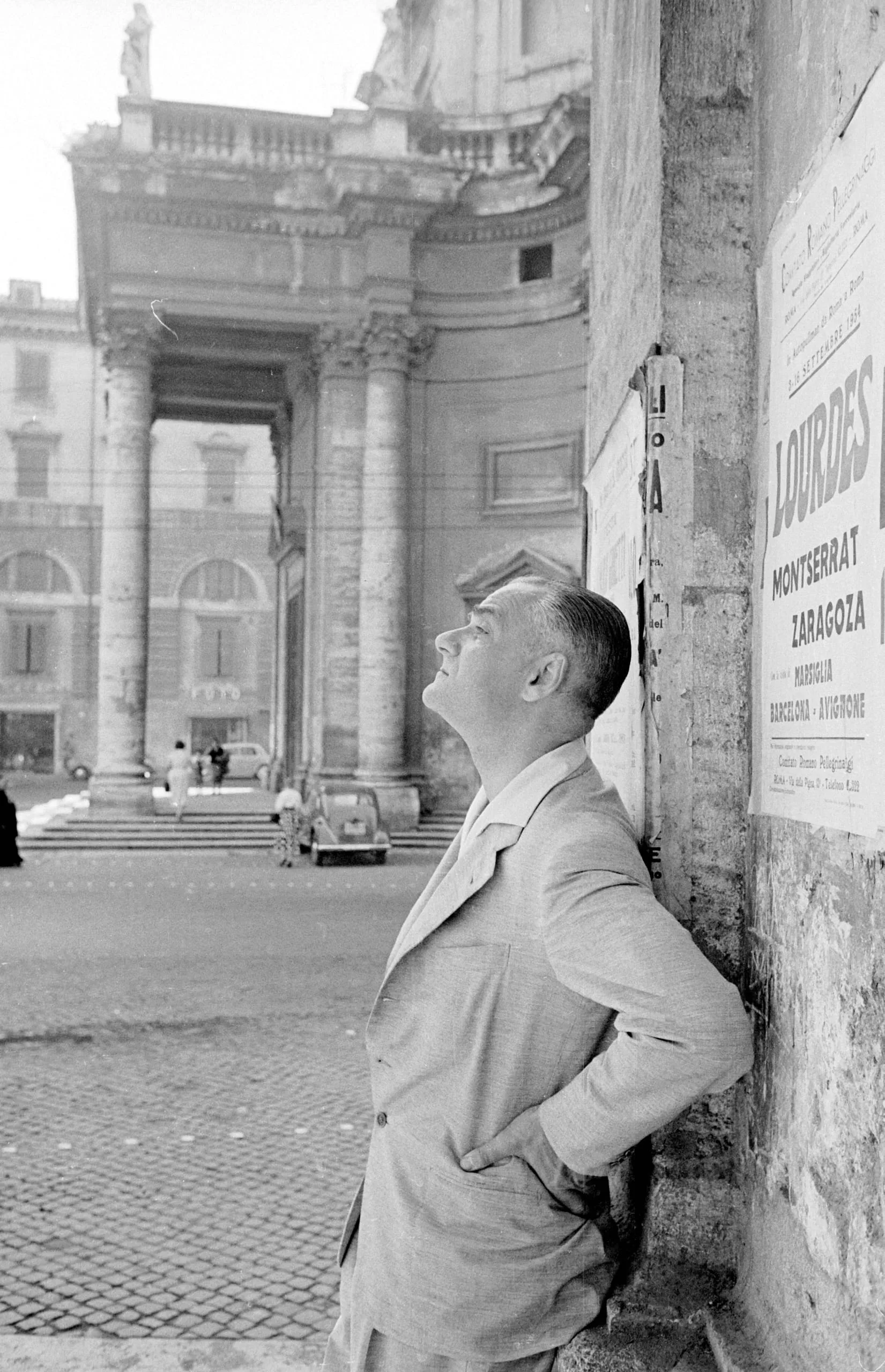 Black and white photograph of a heavyset man in a light suit leaning against a stone wall, looking upward, with a pilgrimage poster and a columned Baroque building visible behind him