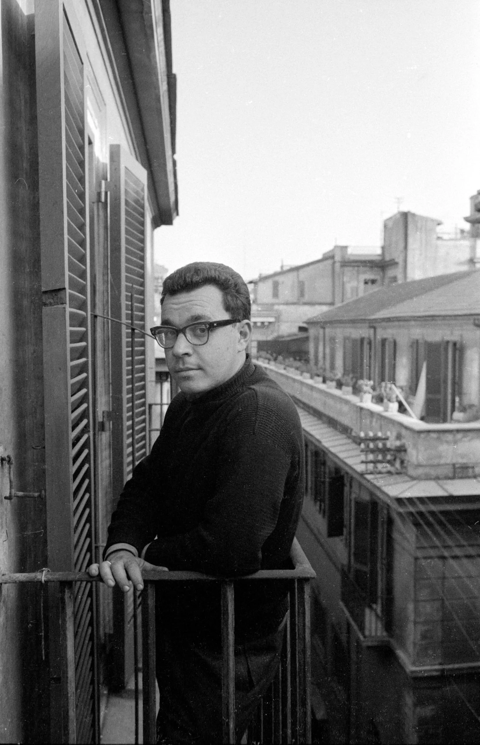 Black and white photograph of a man in a dark turtleneck and cat-eye glasses leaning on a balcony railing, urban rooftops behind him