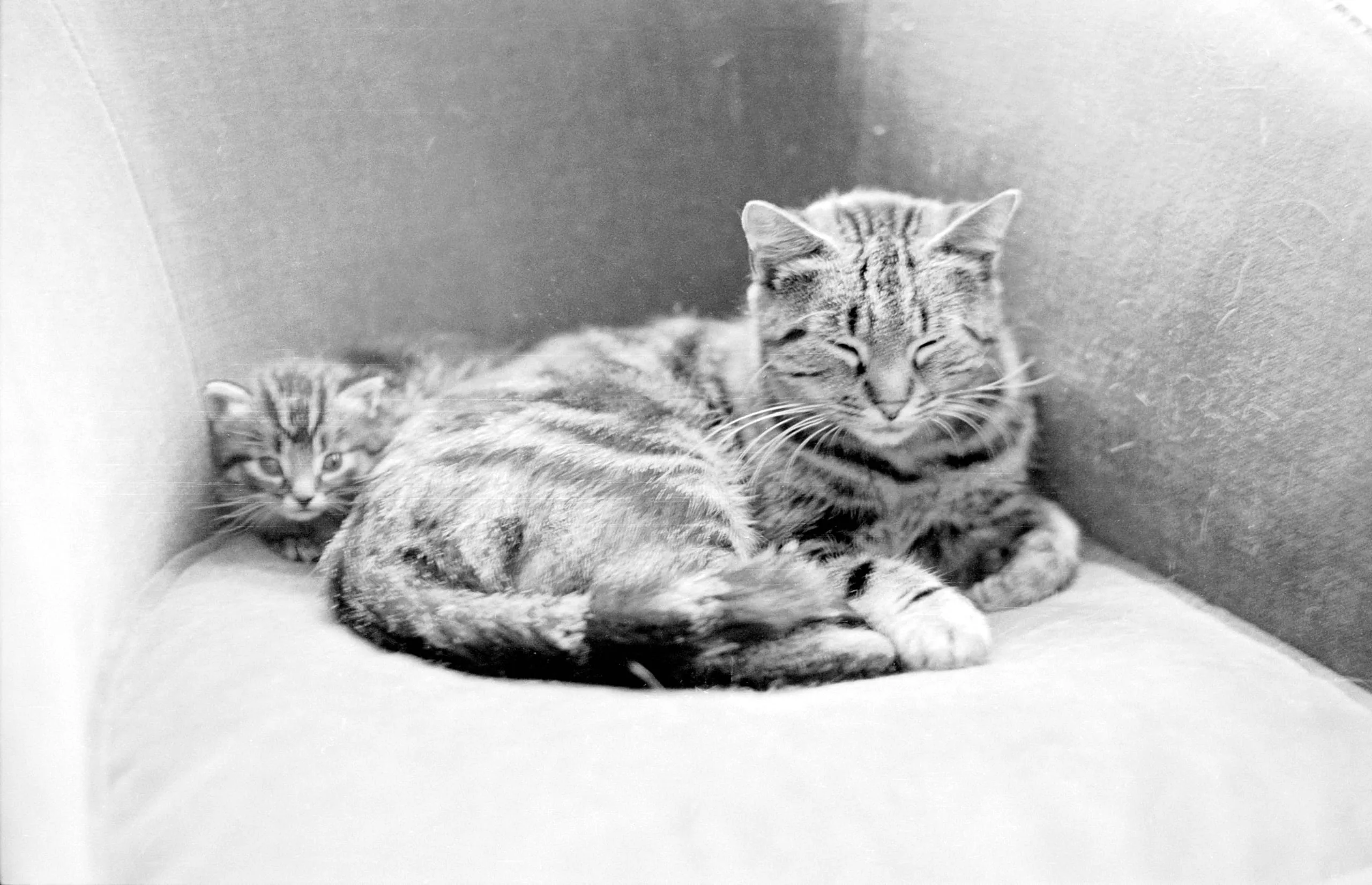 Black and white photograph of a tabby cat resting with eyes half-closed in a box, a small kitten visible behind it to the left