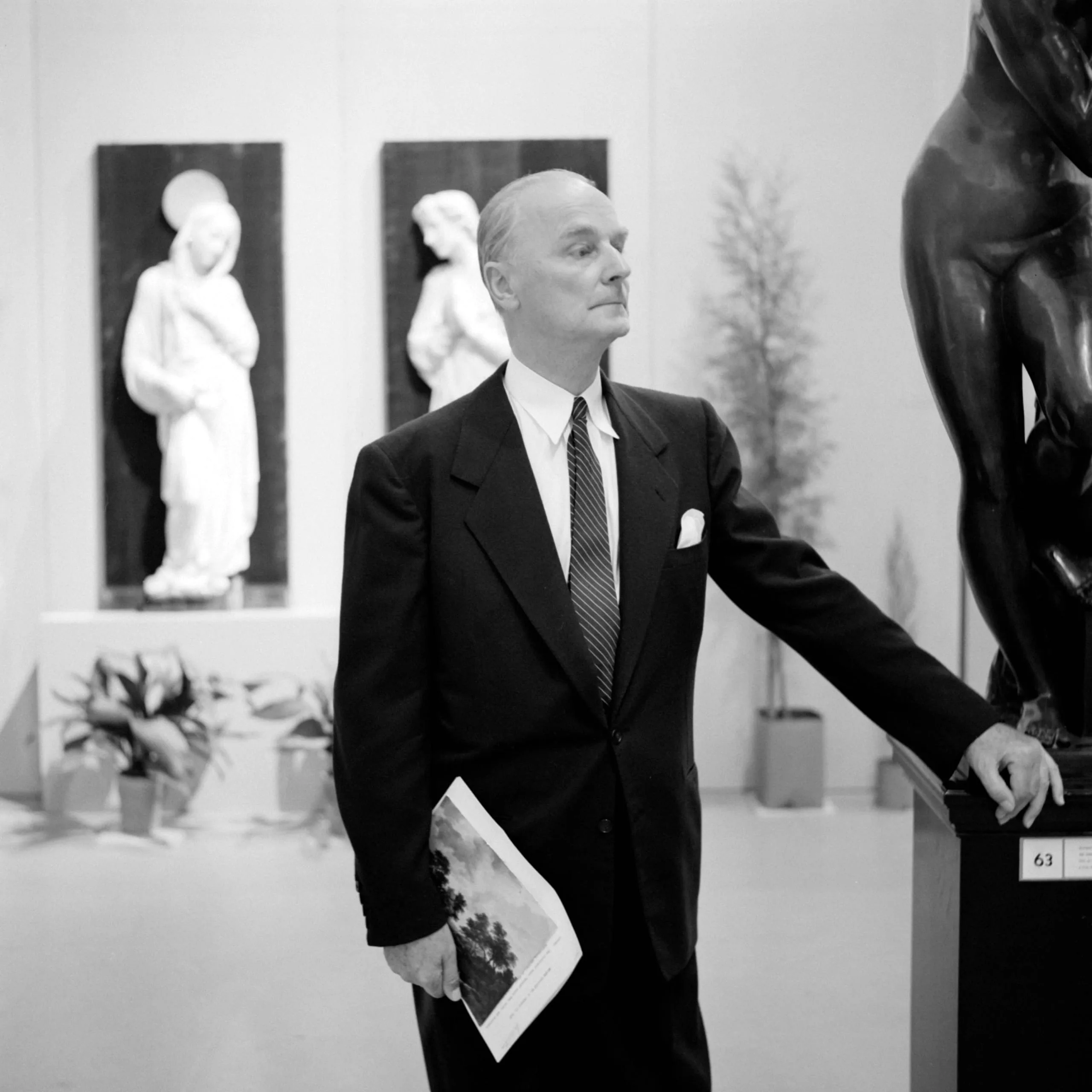 Black and white photograph of a man in a dark suit standing in a gallery, resting his hand on the base of a dark bronze sculpture
