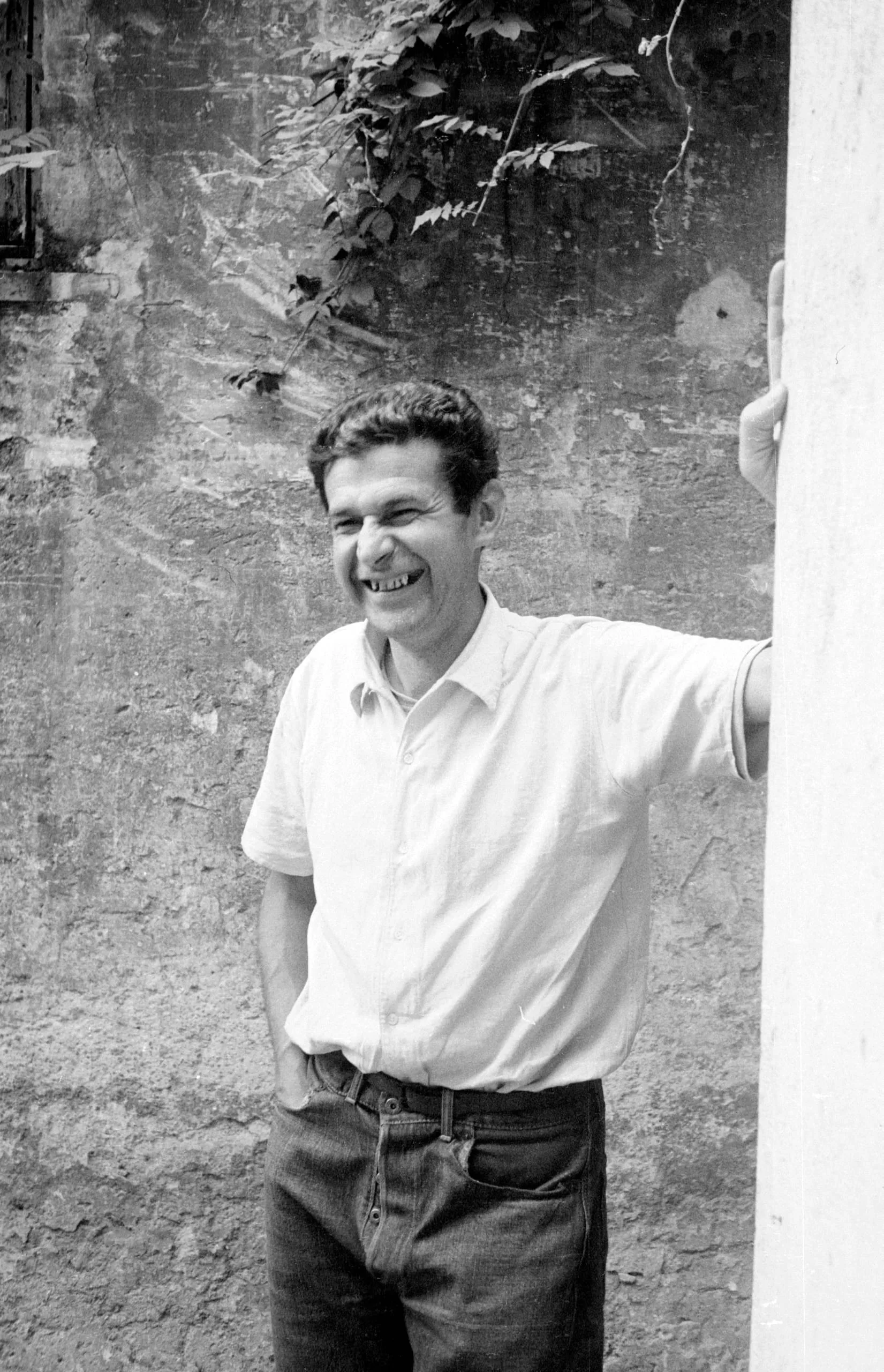 Black and white photograph, man from the hips up leaning against a wall outdoors, head turned left with mouth open wide, wearing a white short-sleeved shirt and dark jeans