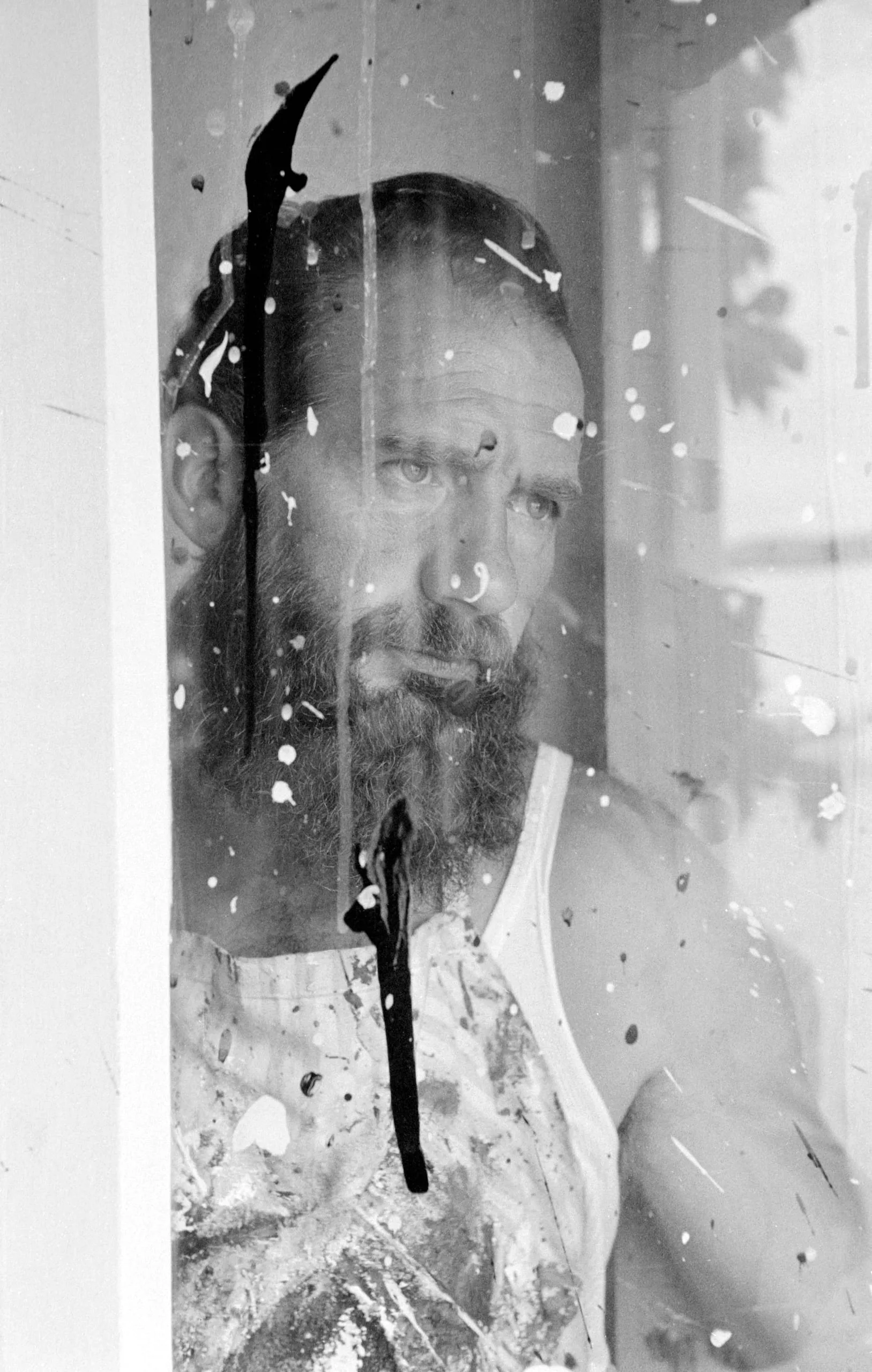 Black and white portrait photograph of a bearded man in a paint-spattered undershirt, seen through a glass pane covered in paint drips and splatters