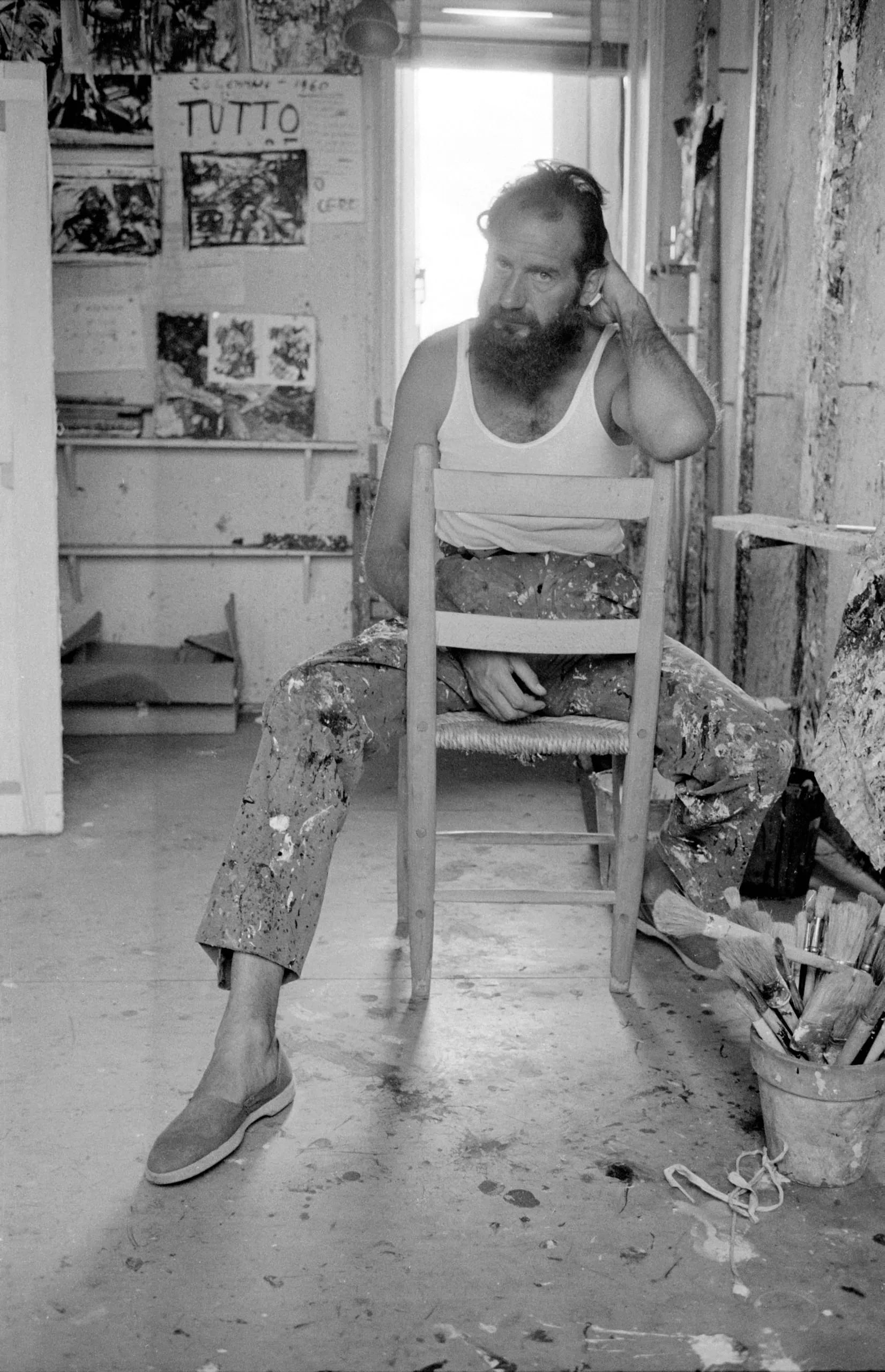 Black and white photograph of a bearded man seated in a rush-seat wooden chair in a paint-splattered studio, wearing a tank top and paint-covered trousers