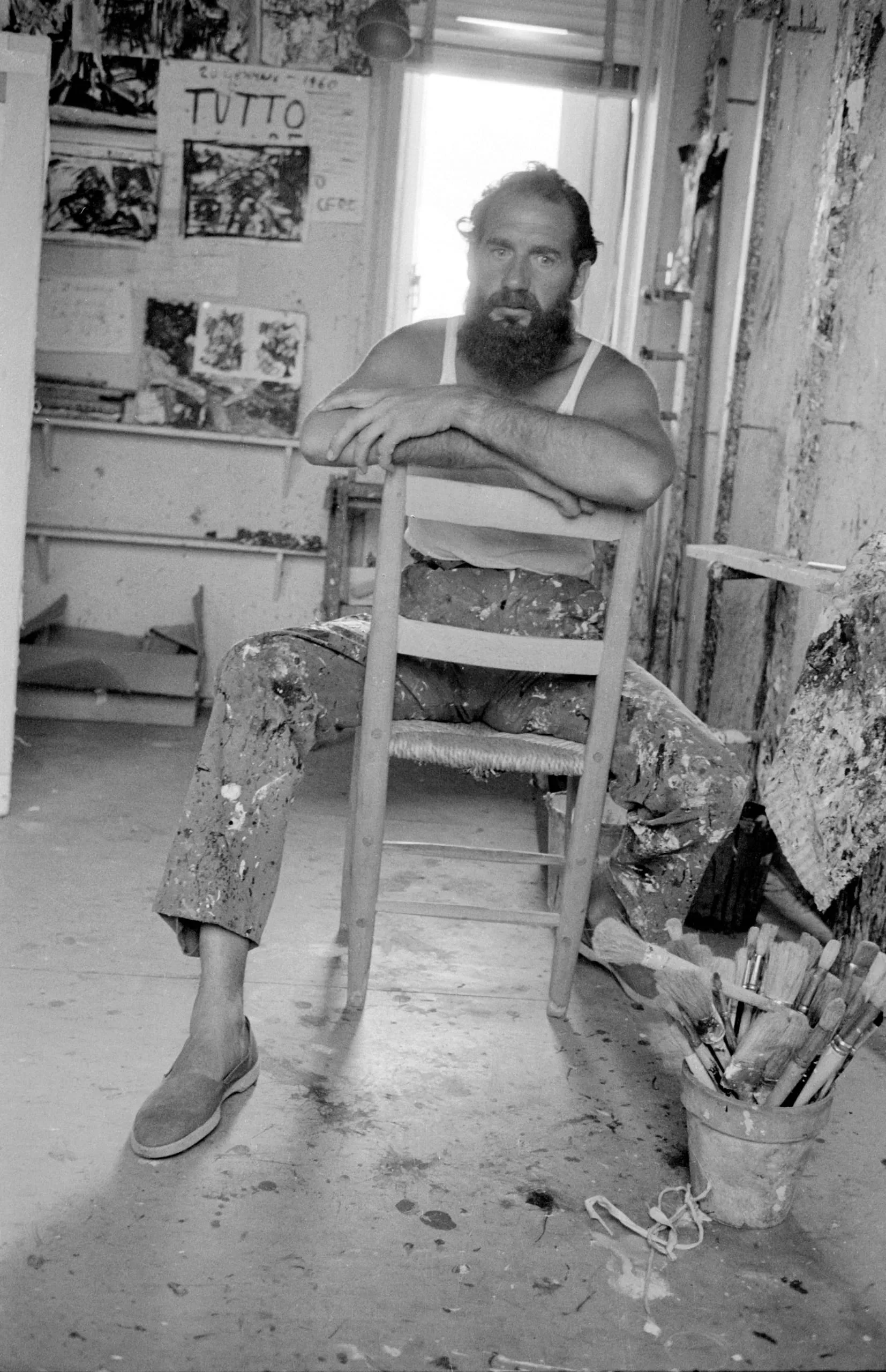 Black and white photograph of a bearded man in paint-splattered trousers straddling a wooden chair backward in an artist's studio, with paintbrushes in a bucket nearby
