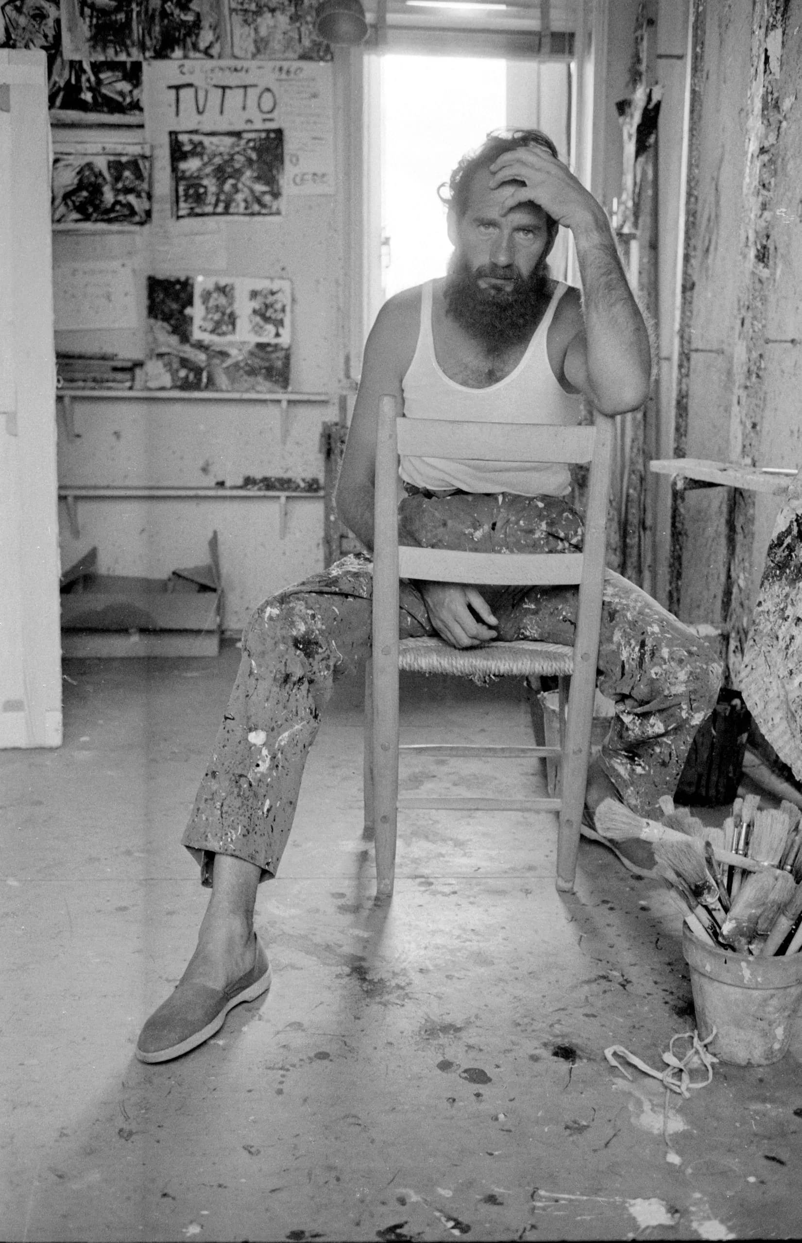 Black and white photograph of a bearded white man in a paint-splattered trousers and sleeveless shirt, seated in a wooden chair in an artist's studio, hand raised to his temple