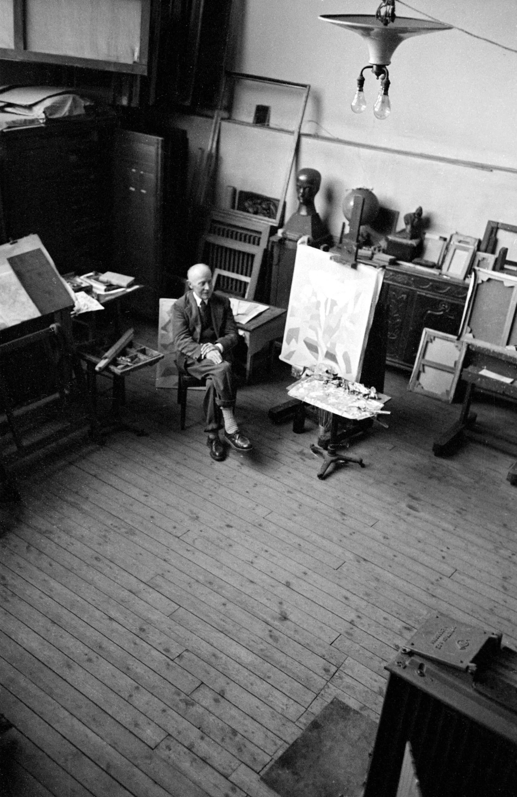 Black and white photograph taken from a high angle looking down into an artist's studio; an older man in a suit sits in a chair near an easel holding a botanical painting