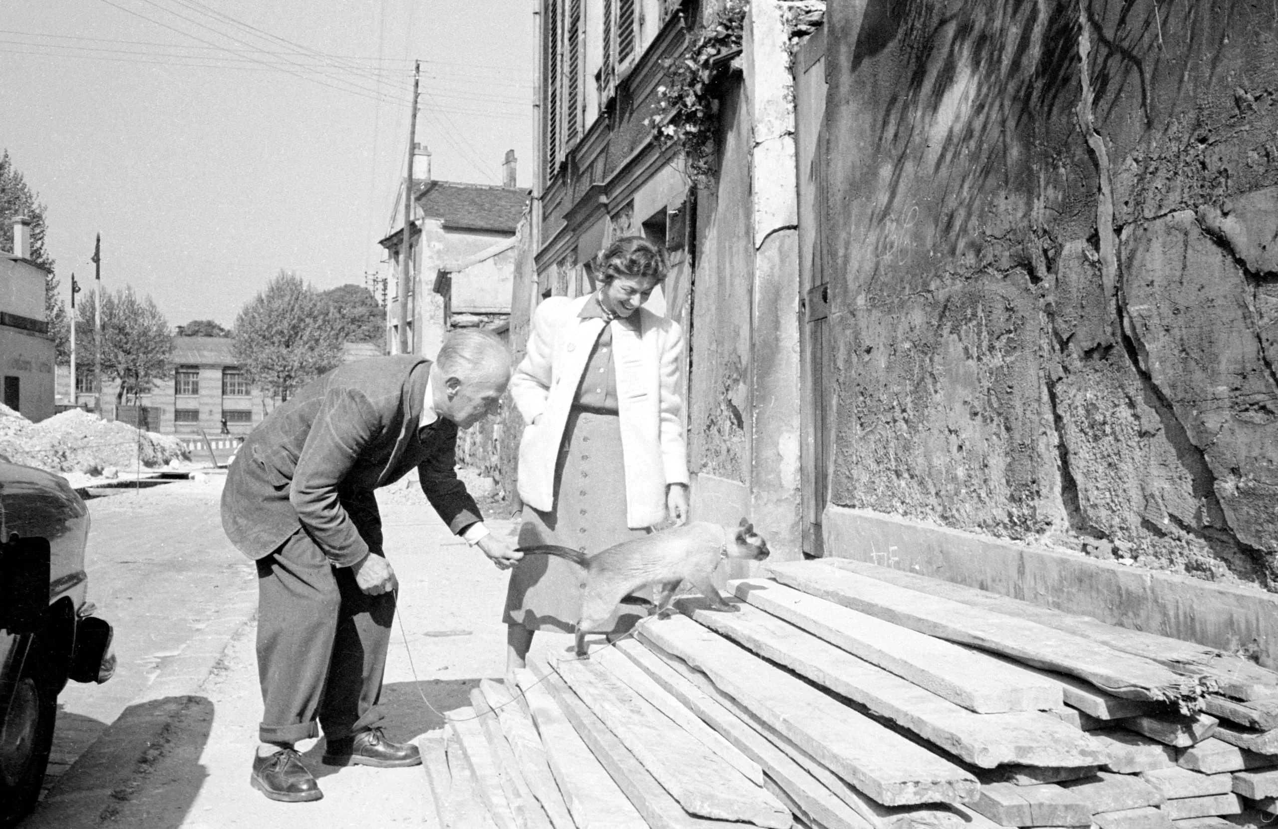 Black and white photograph of a man bending toward a cat perched on stacked lumber while a woman stands nearby beside a crumbling building facade