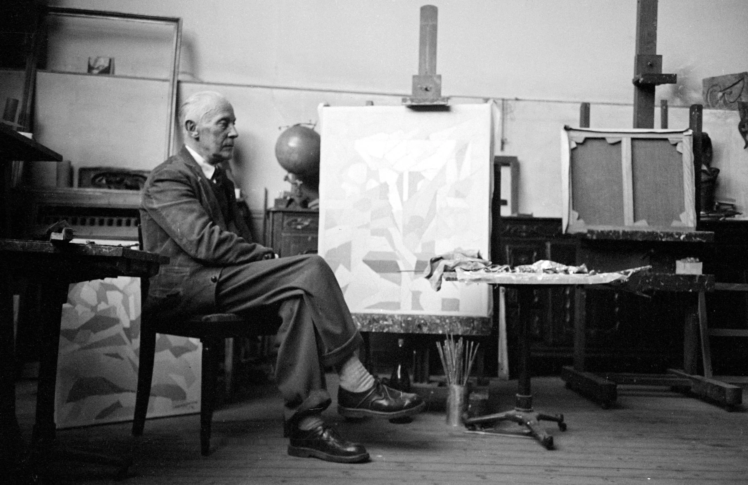 Black and white photograph of an elderly white-haired man in a suit seated in profile in an artist's studio, with an abstract painting on an easel beside him