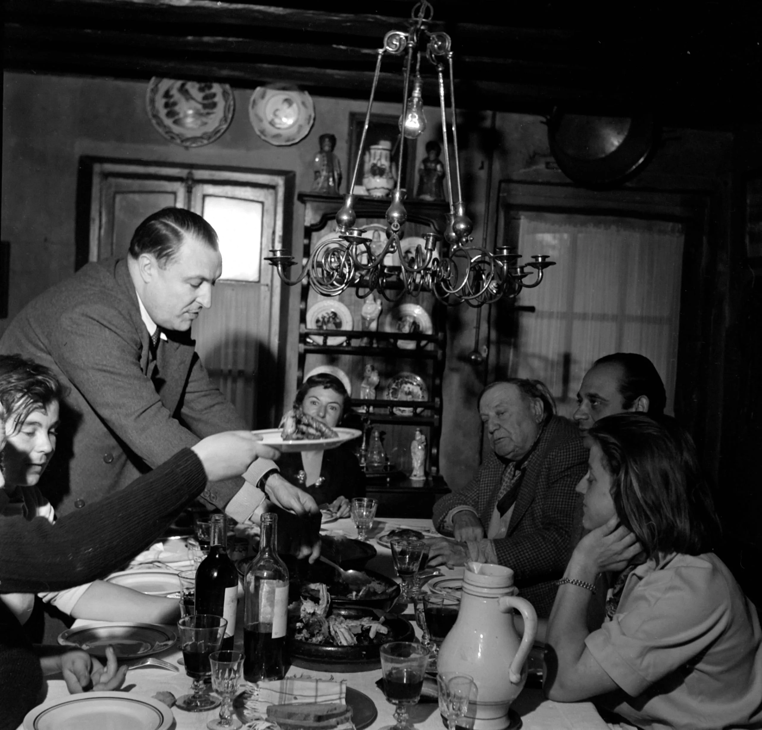 Black and white photograph of a group of adults at a dinner table, one standing man serving food while others sit among wine glasses, bottles, and plates