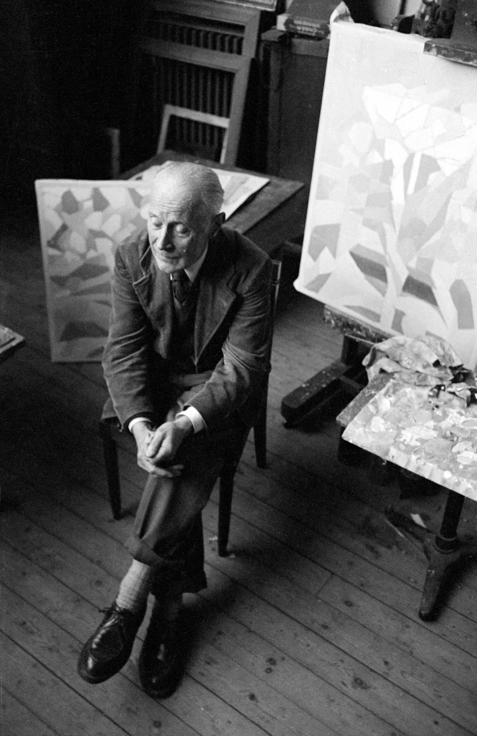 Black and white photograph looking down at an elderly man in a dark suit seated on a stool in a painter's studio, surrounded by canvases with floral compositions
