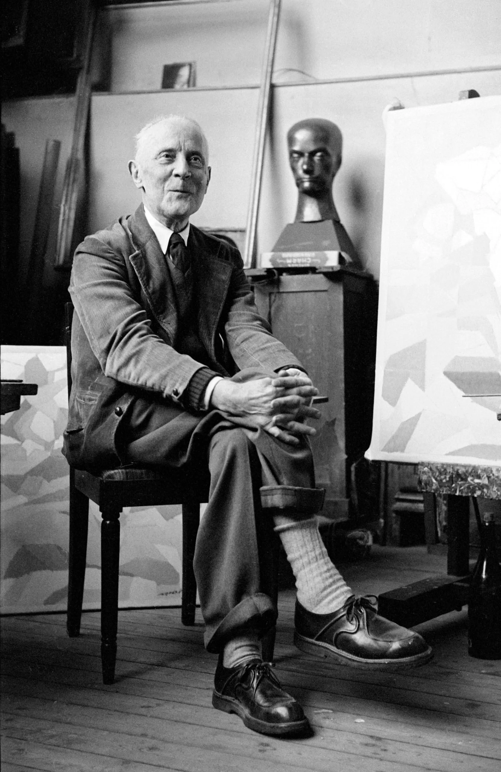 Black and white photograph of an elderly white man seated in a wood chair in an art studio, legs crossed, hands clasped, surrounded by geometric abstract paintings and a sculptural bust