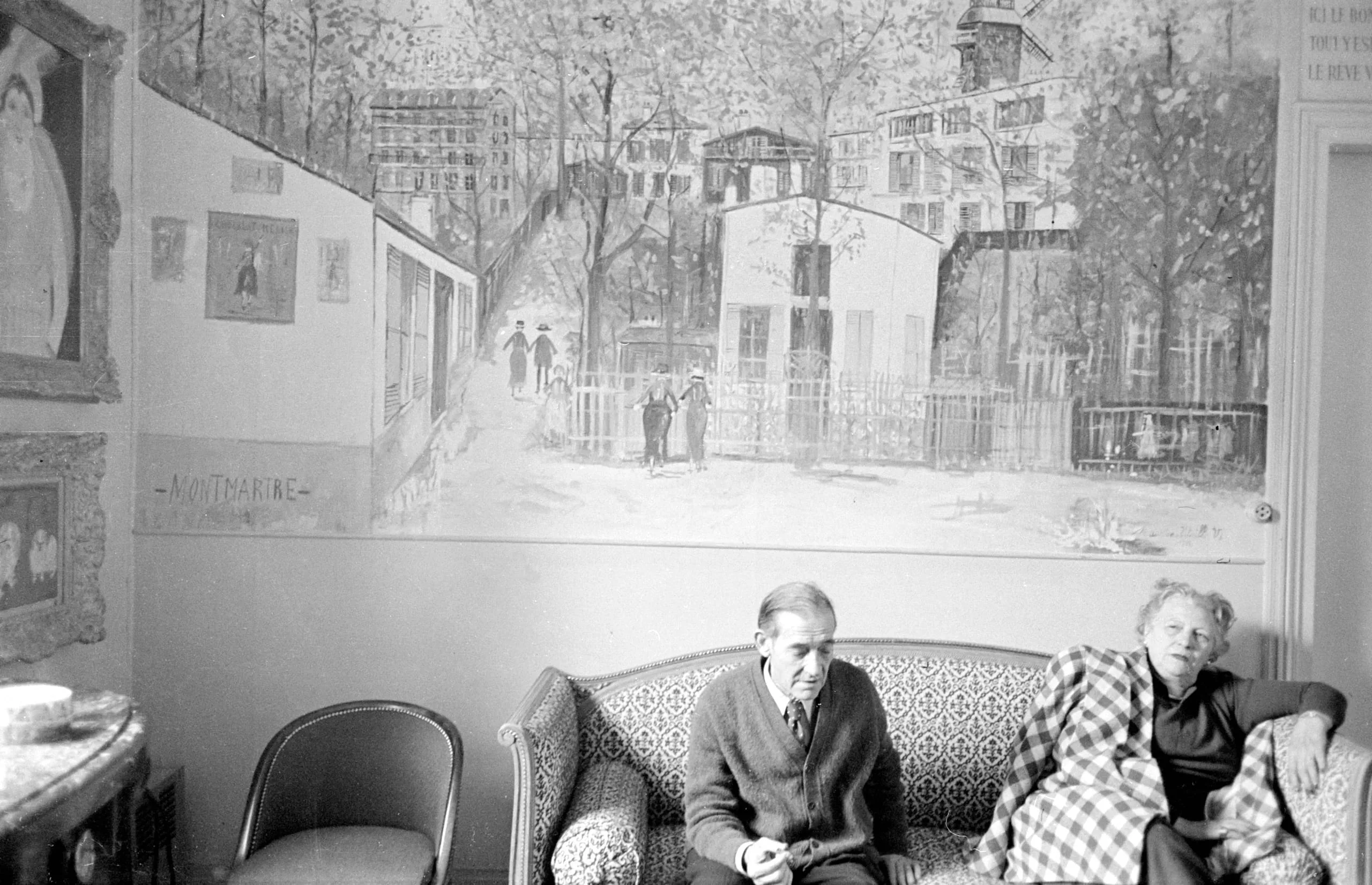 Black and white photograph of a man and woman seated on a patterned sofa beneath a large painted Montmartre street scene mural