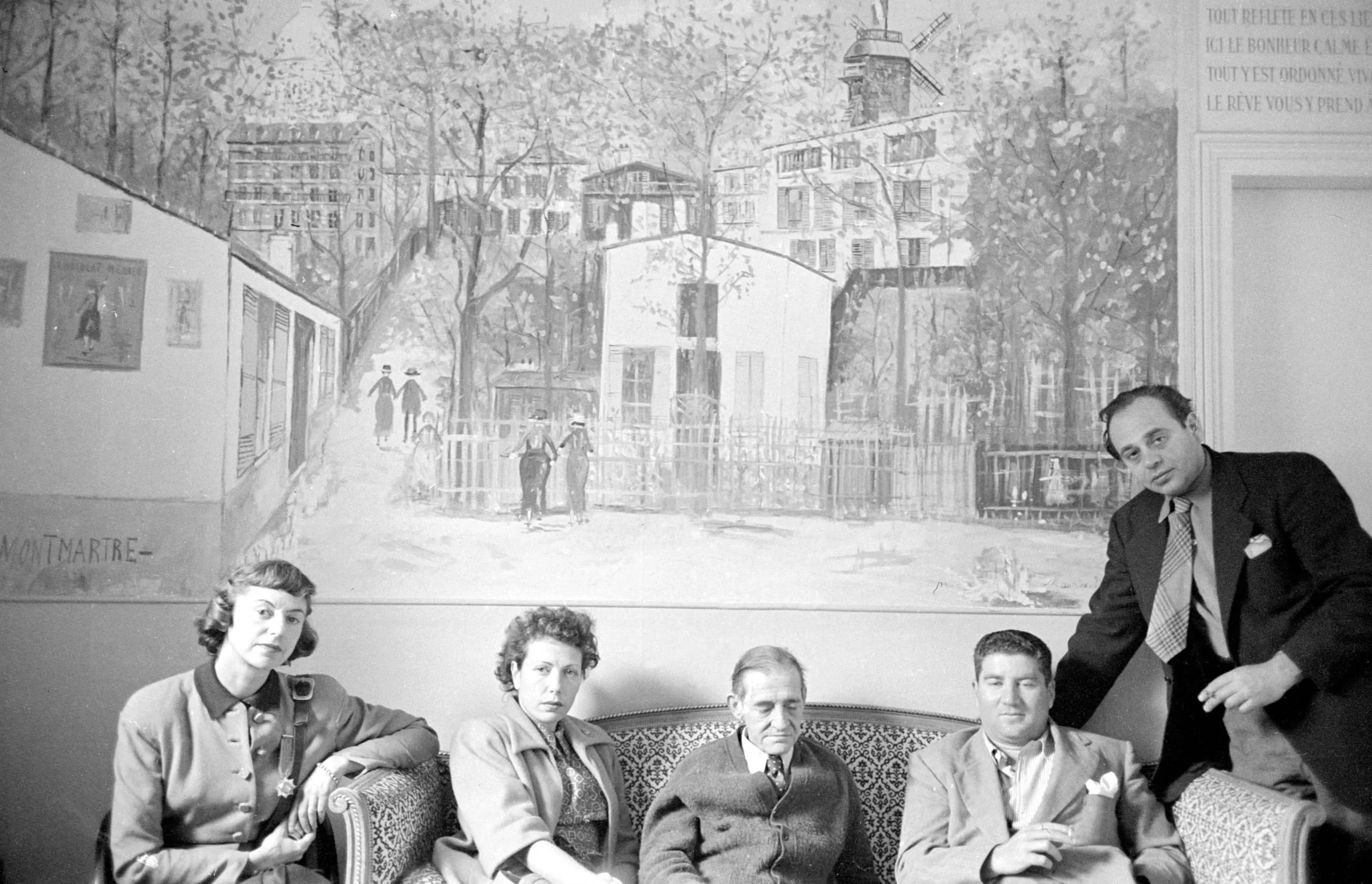 Black and white photograph of four people seated on a patterned sofa and one man standing, posed in front of a large painted mural of a Parisian street scene labeled 'Montmartre'