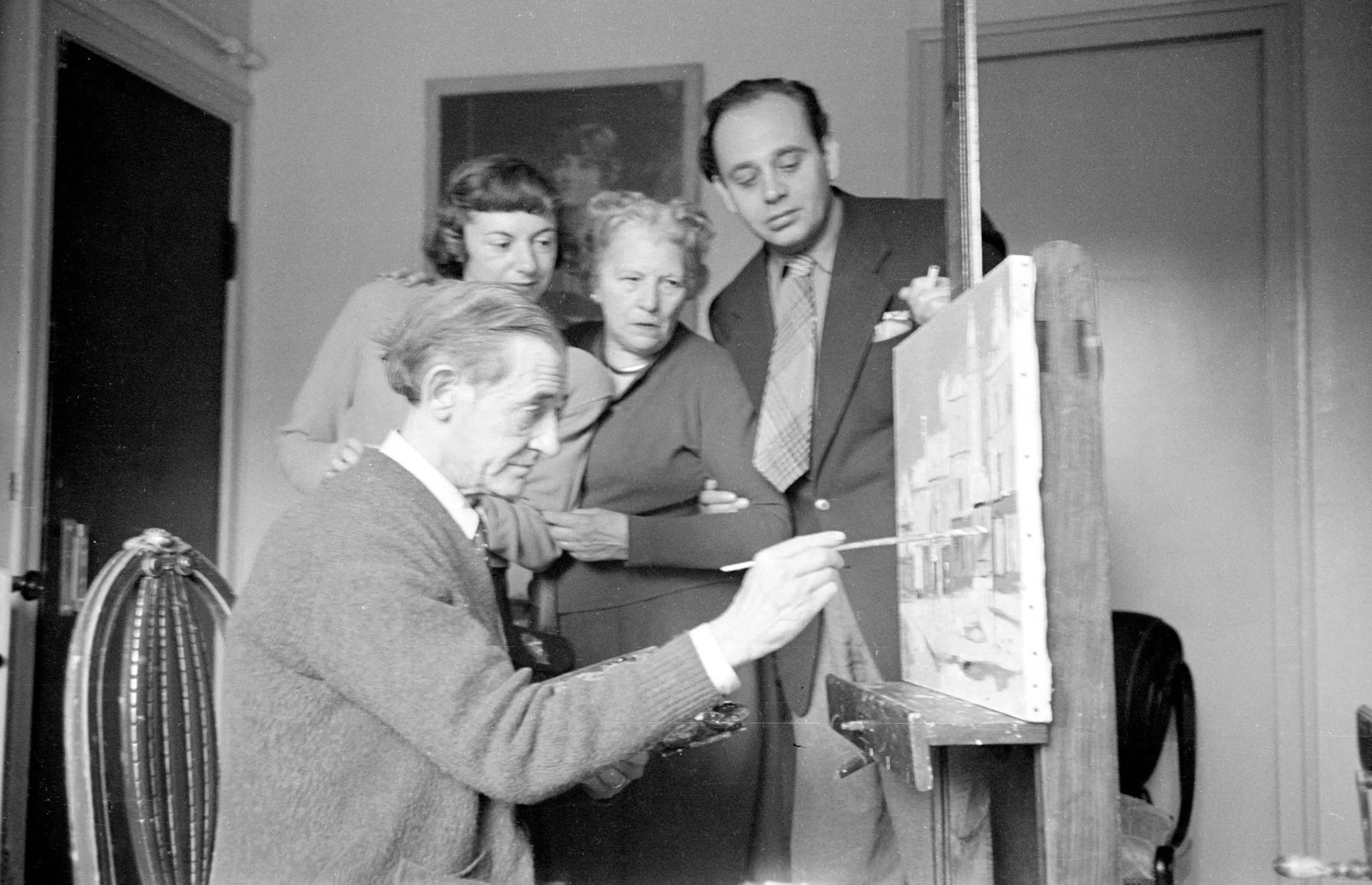Black and white photograph of four adults gathered around a wooden easel indoors, watching a seated man paint a small canvas