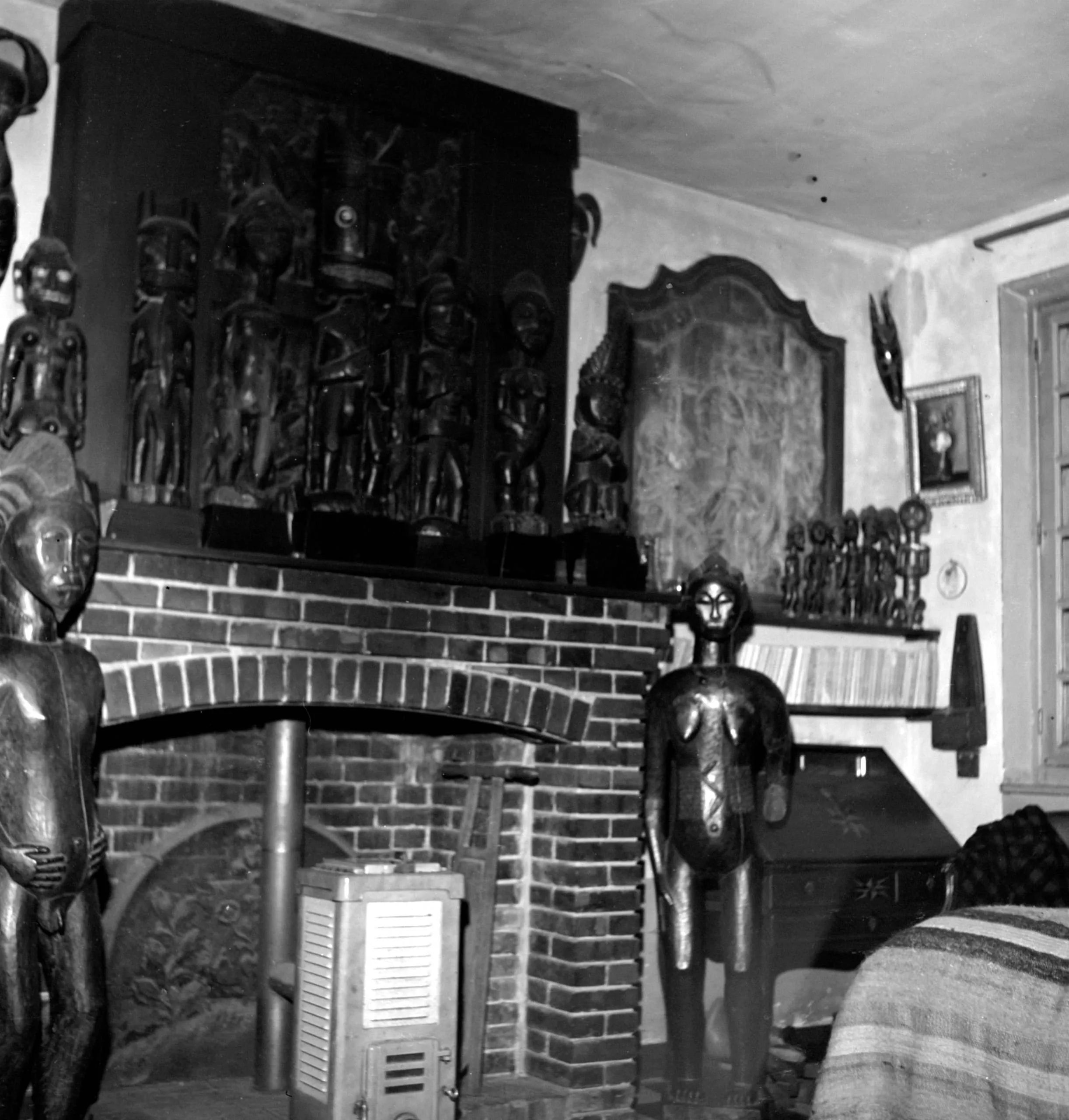 Black and white photograph of a brick fireplace and surrounding room interior densely filled with dark wooden African figurative sculptures on the mantelpiece, floor, and shelves
