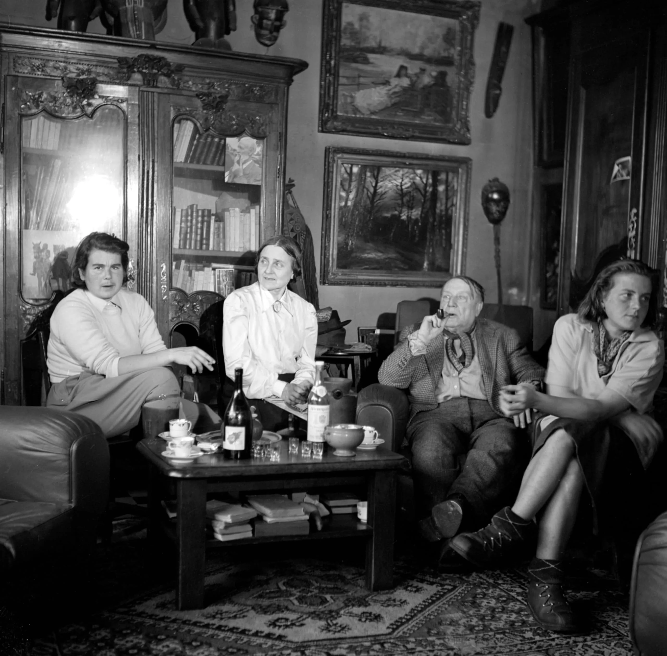Black and white photograph of four white adults seated in a furnished living room with a coffee table, bookshelves, and framed paintings visible in the background