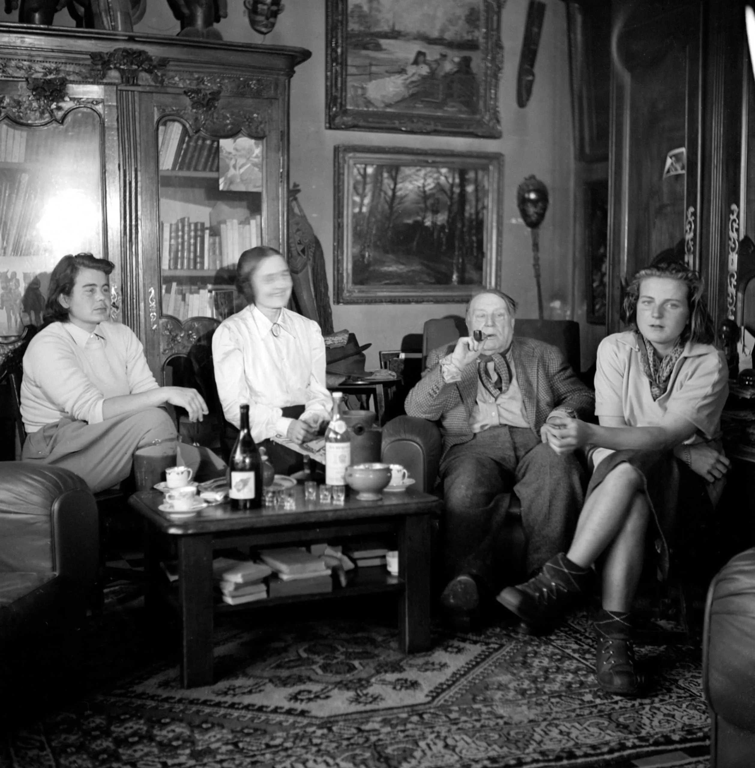 Black and white photograph of four people — three young adults and one elderly man — seated in a furnished living room around a coffee table with bottles and cups