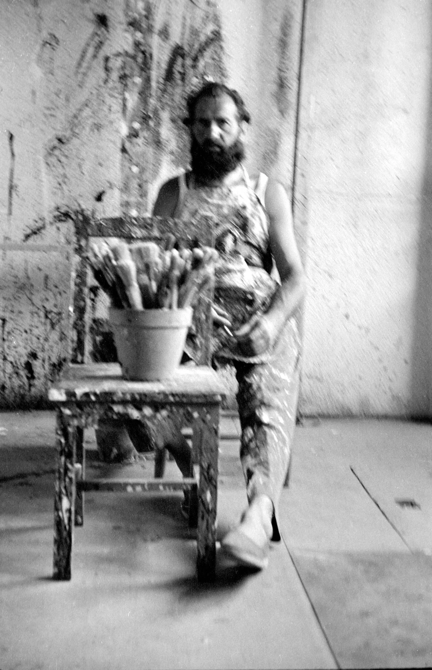 Black and white photograph of a bearded man in paint-splattered clothing standing behind a paint-covered wooden chair holding a pot of paintbrushes, in an artist's studio