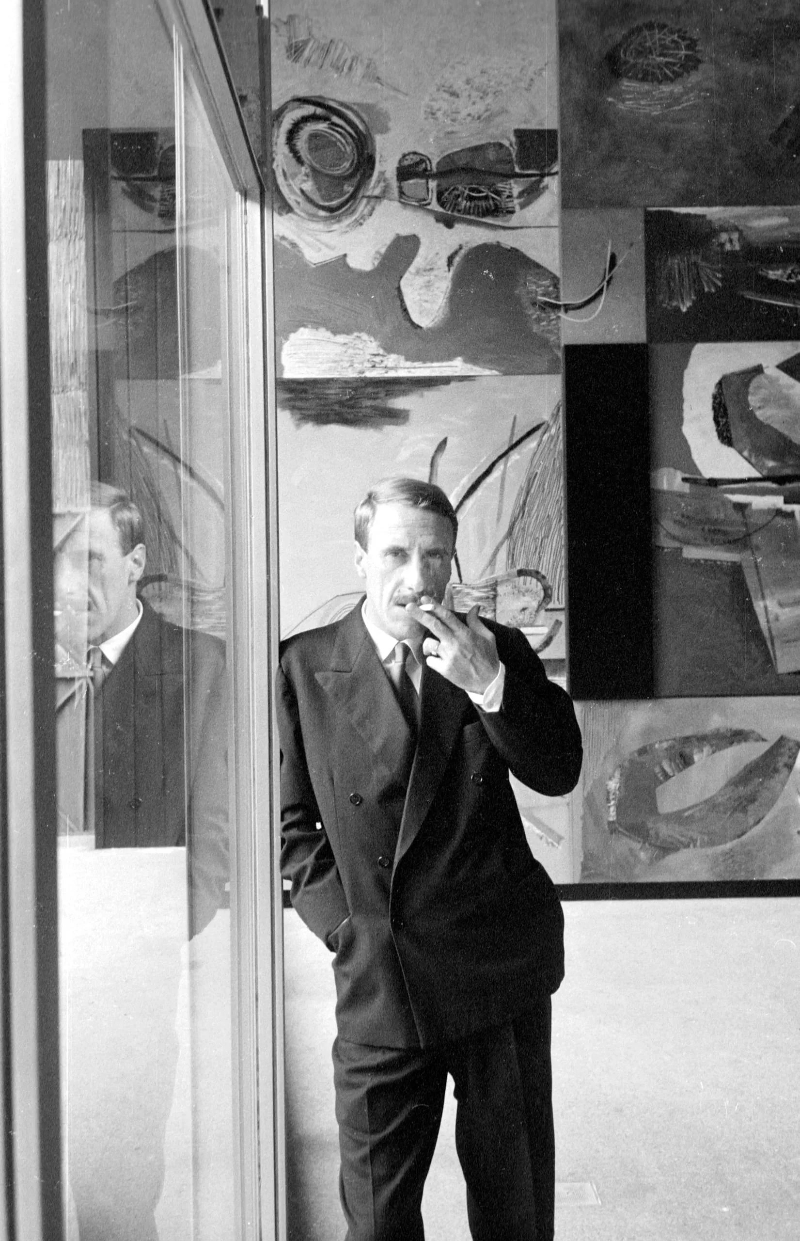 Black and white photograph of a man in a double-breasted suit holding a cigarette to his lips, standing before abstract paintings, his profile reflected in a glass panel to our left