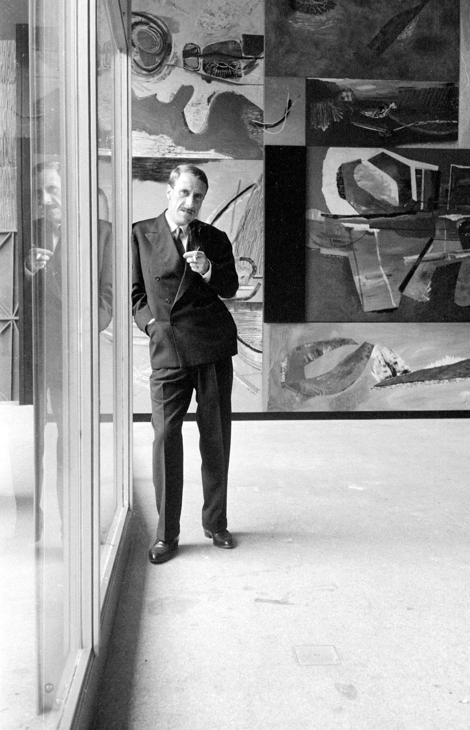 Black and white photograph of a man in a dark double-breasted suit standing in a gallery, large abstract paintings on the wall behind him, glass partition to his left
